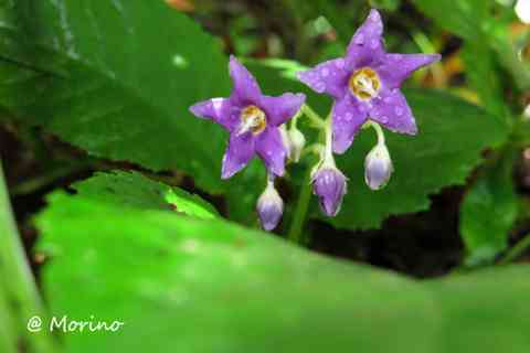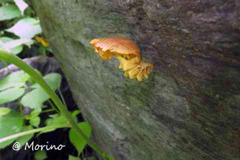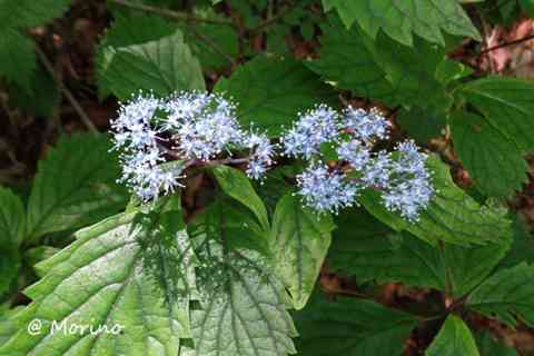 散策開始から1時間後休憩している東屋の水道でイワタバコが開花、上旬から見られたモリアオガエルの卵塊が薄茶色に