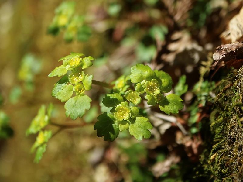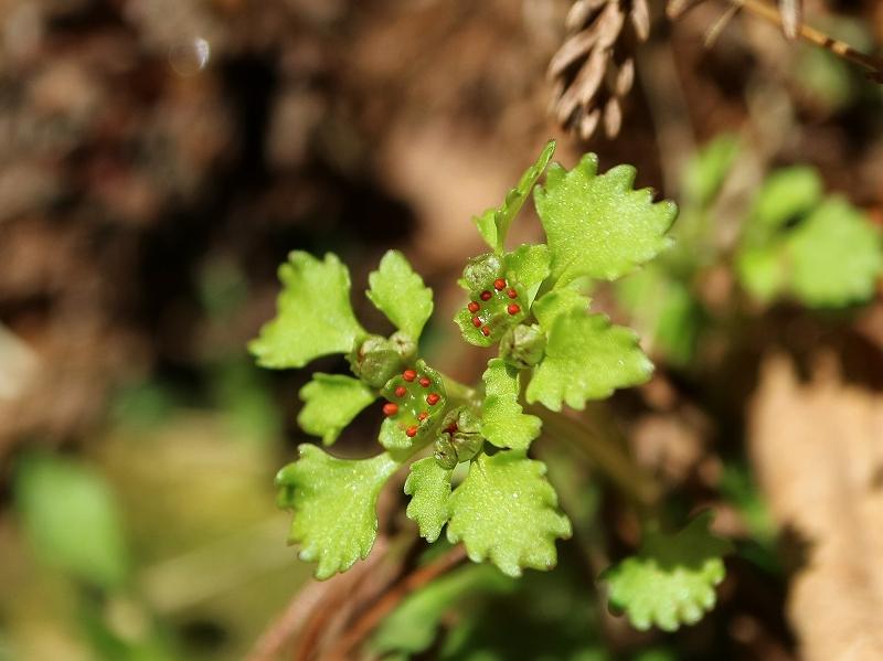イワネコノメソウ まだ早くて花が出ているのが少ない その内一面に出るのに せっかちな私は待っていられない ルーペでオレンジの葯の付いているのを探して撮りました。
