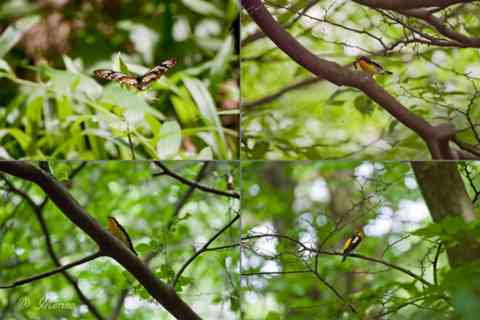 左下:一寸暗い樹木の下で囀る、キビタキ