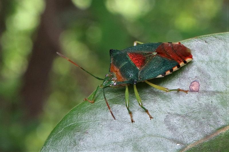 タブノキの葉の上にきれいなカメムシが セアカツノカメムシかな?