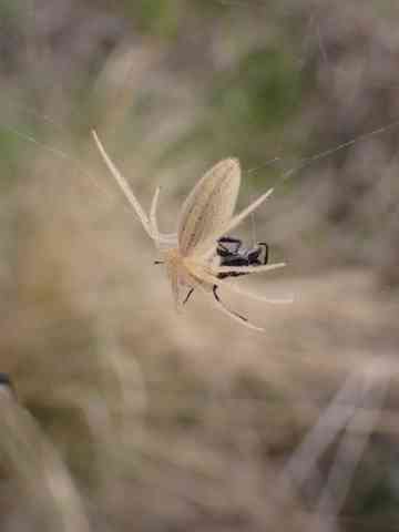 玉村町の利根川河川敷で、ヨシの枯れ葉に円網を張って獲物をつかまえていました。彼女はコガネグモをだますのでしょうか? ヒトをだますのでは?