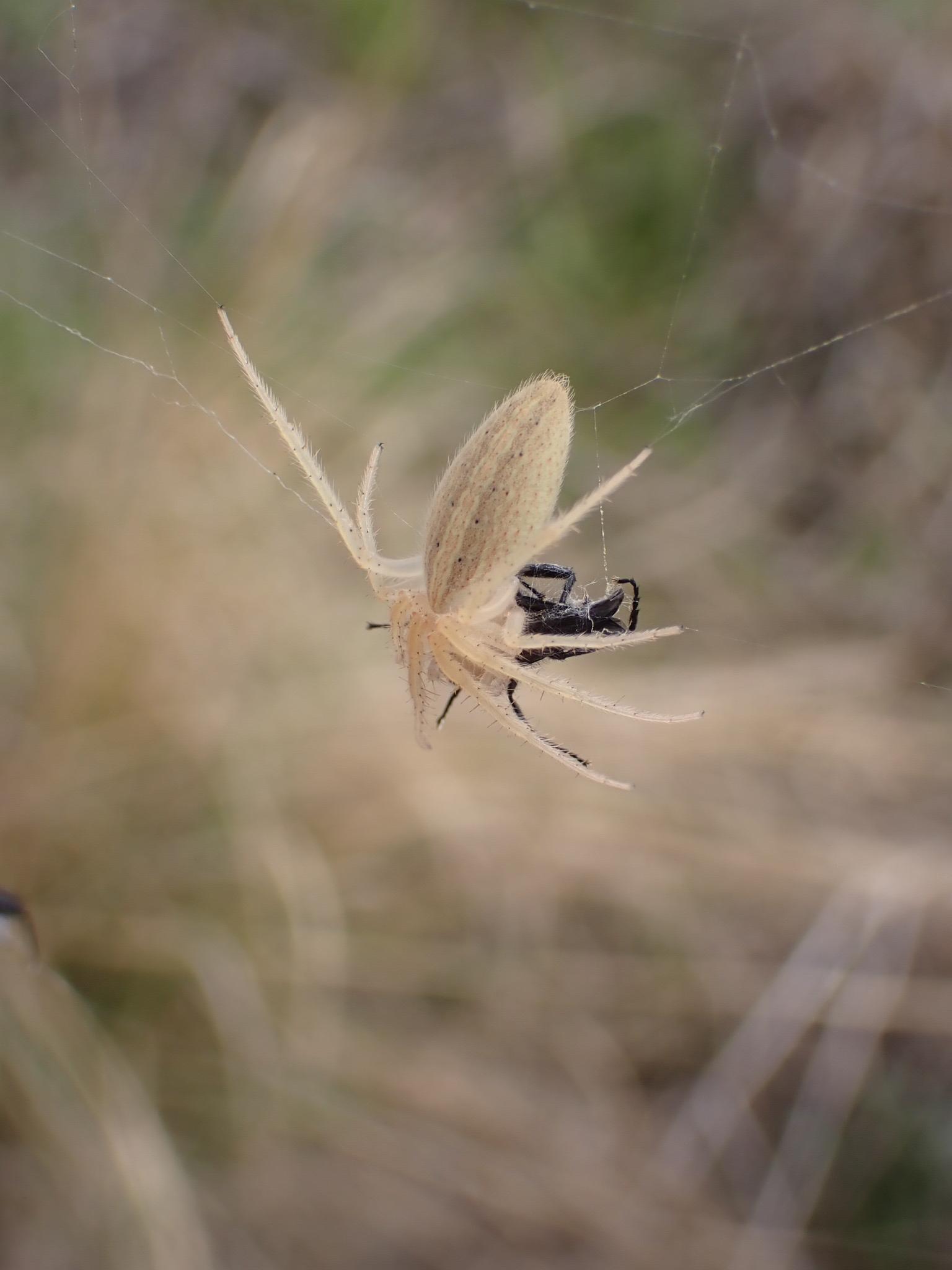 玉村町の利根川河川敷で、ヨシの枯れ葉に円網を張って獲物をつかまえていました。彼女はコガネグモをだますのでしょうか? ヒトをだますのでは?