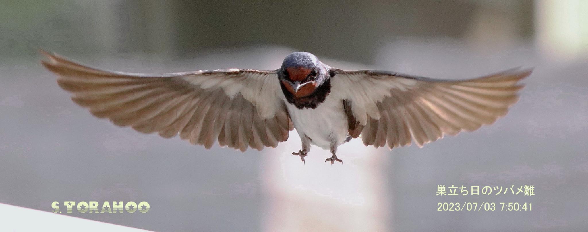 わが家で7月3日の早朝、ツバメ4羽の雛が巣立ちしました。内、1羽の雛を3mの至近でフェンスにパーチする直前を連写ではない一発勝負にて真正面から捉えたシーンです。(とても、巣立ち直後の雛とは思えず猛禽類的な顔の表情に背景のボケ味も一役)