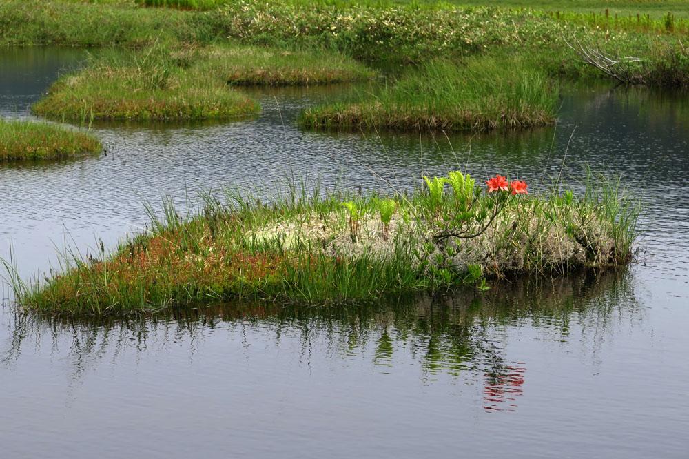 ヨッピ吊橋過ぎた池塘で浮島がいくつも