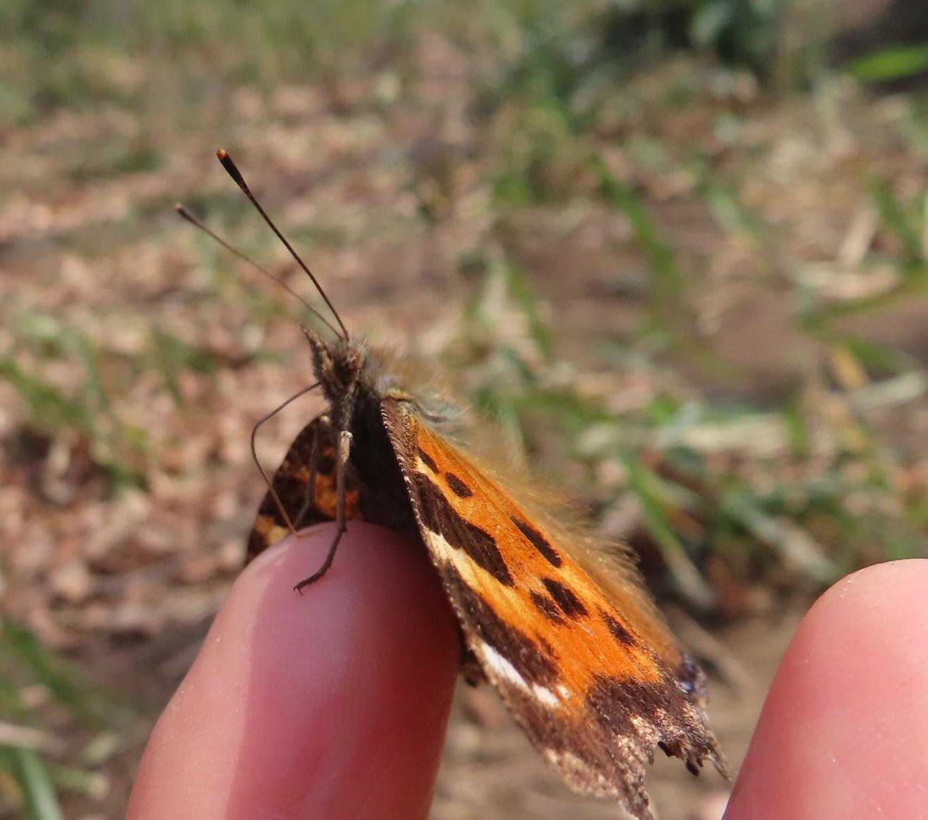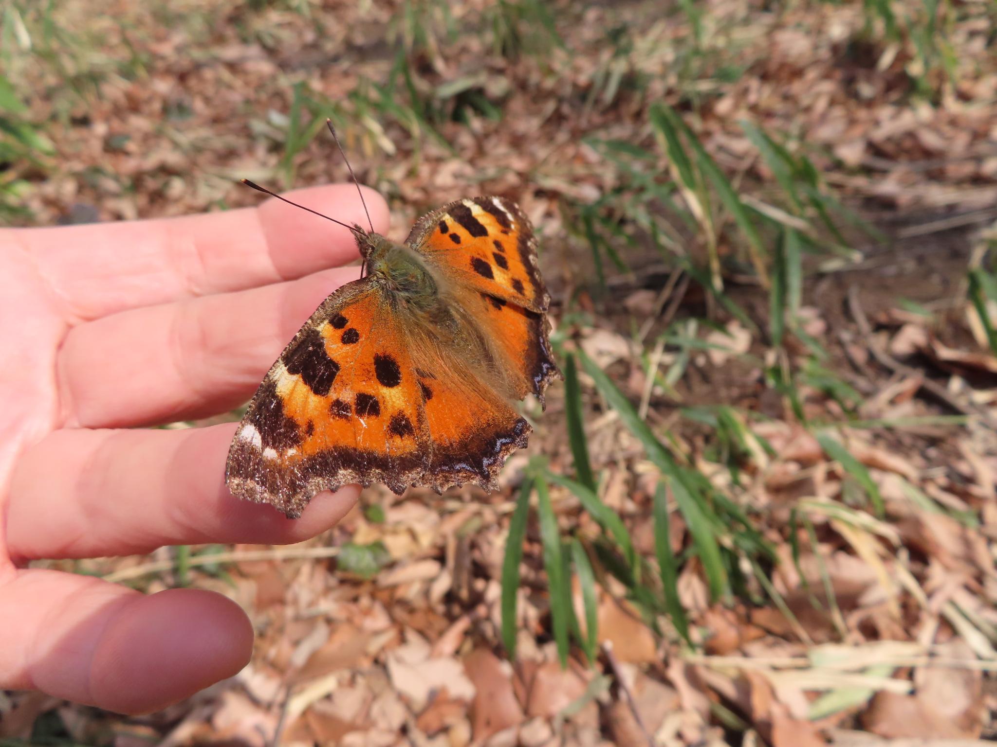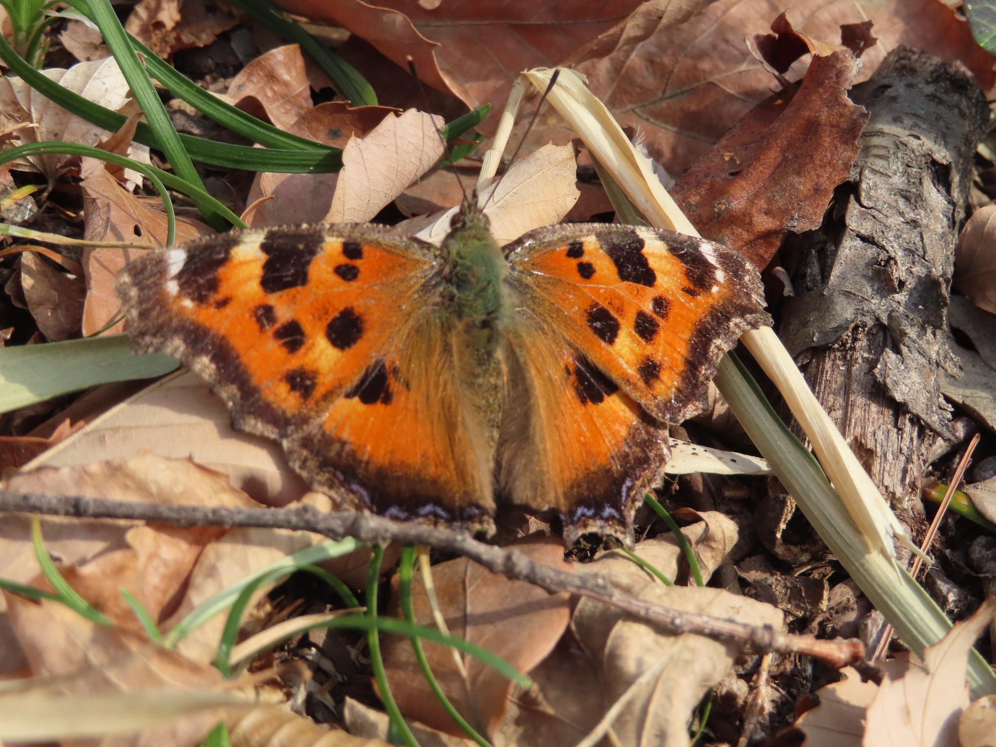 このところの気温上昇で、冬を越していたヒオドシチョウが飛び始めました。