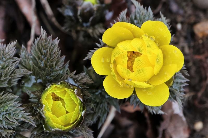 日曜の天気予報は雨のち晴れとなっている 雨の滴がついた福寿草が