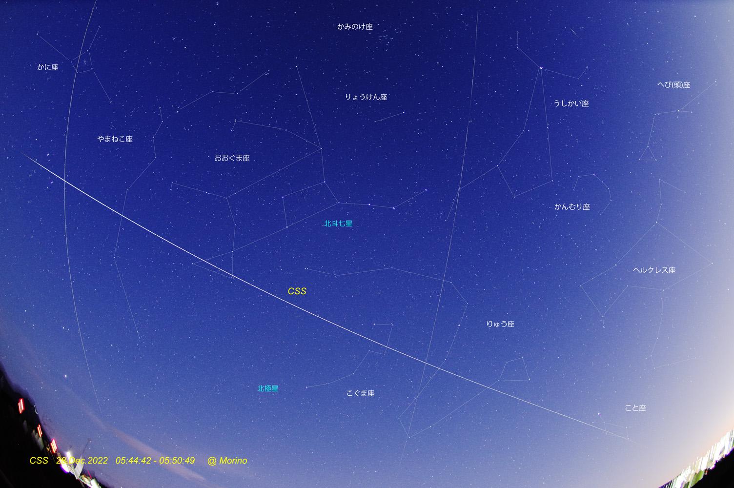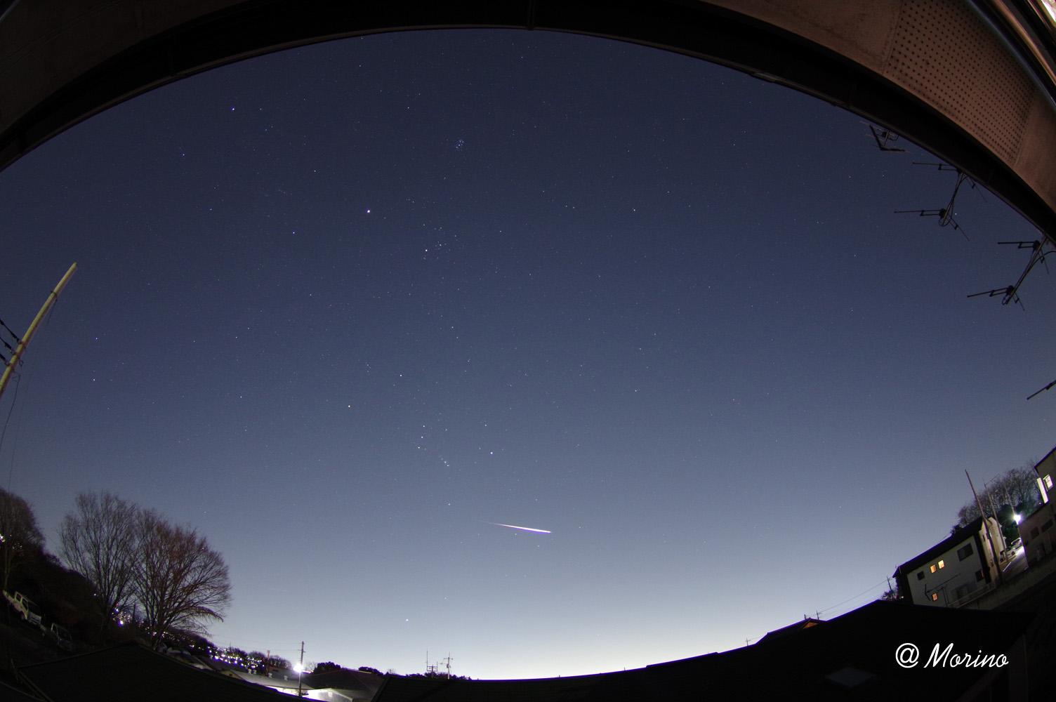 12/28、日の出まで約1時間有り星座識別可能な撮影に、対角魚眼画角内で見え始めから終わりまで、
