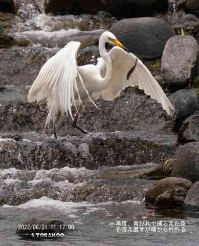 6月21日、自宅直近の碓氷川の安中市板鼻堰で観察撮影しました。ダイサギが魚道の縁から川の上流に上がろうとする魚【オイカワ】を狙って捕獲する貴重なドラマチックな場面です。ダイサギはサギ類の中でも最も大型で特に首が長く脚も強靭、強い水流の中でも餌探しが他のサギ類より優れているようです。連続画像、特に最初〔5-1〕の段差があるような場面は、首長の利便を最大限に生かした画像です。※6月に入り、この板鼻堰は6月20日まで例年恒例の太平洋から利根川を経由し、碓氷川のさらなる上流に溯上する天然アユが多く見られました。サギ類は川魚にとって(特にアユ)最大の天敵です。※オイカワの直接、堰に挑戦する水面飛び出しの画像を番外として6枚目に貼付しました。
