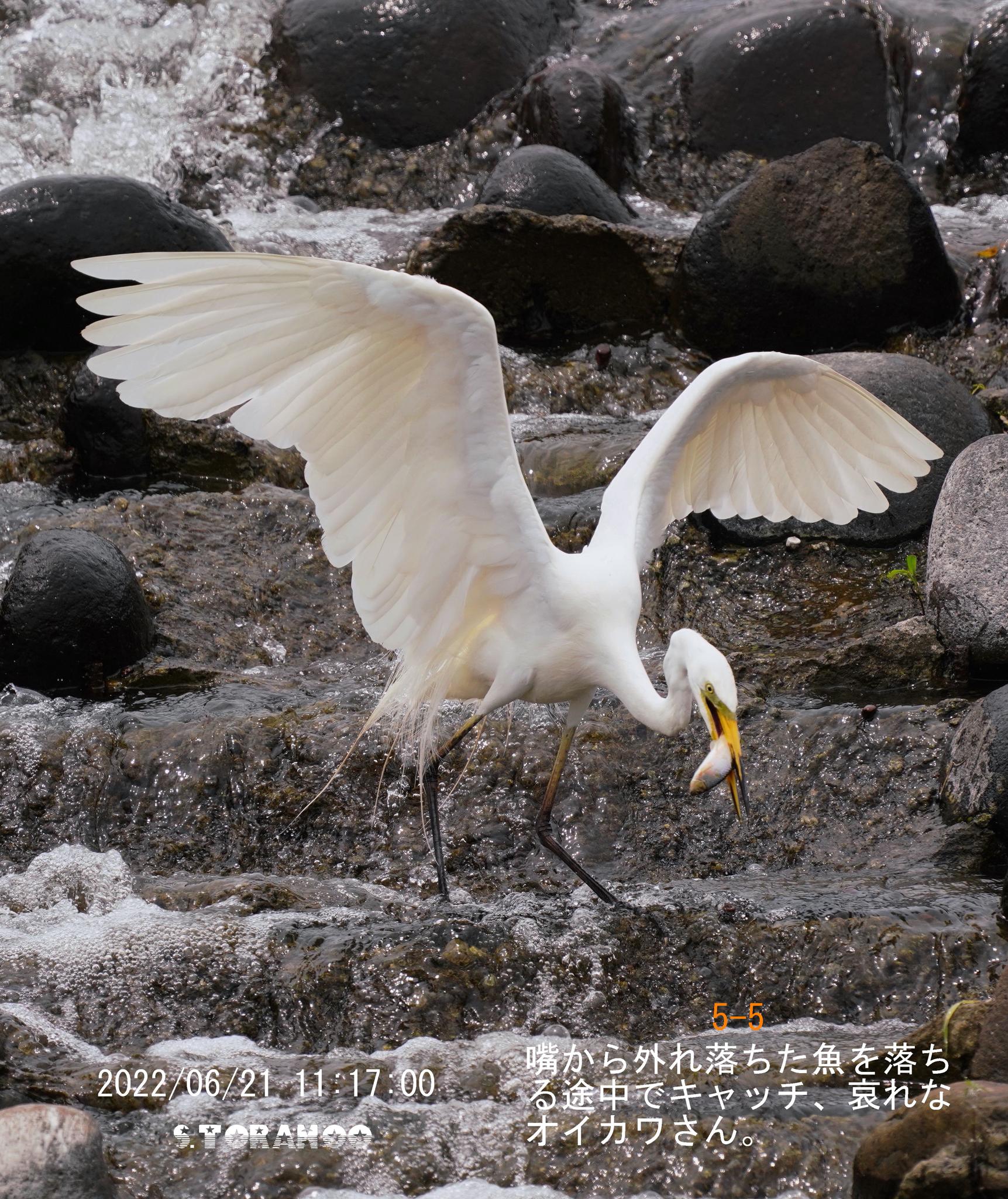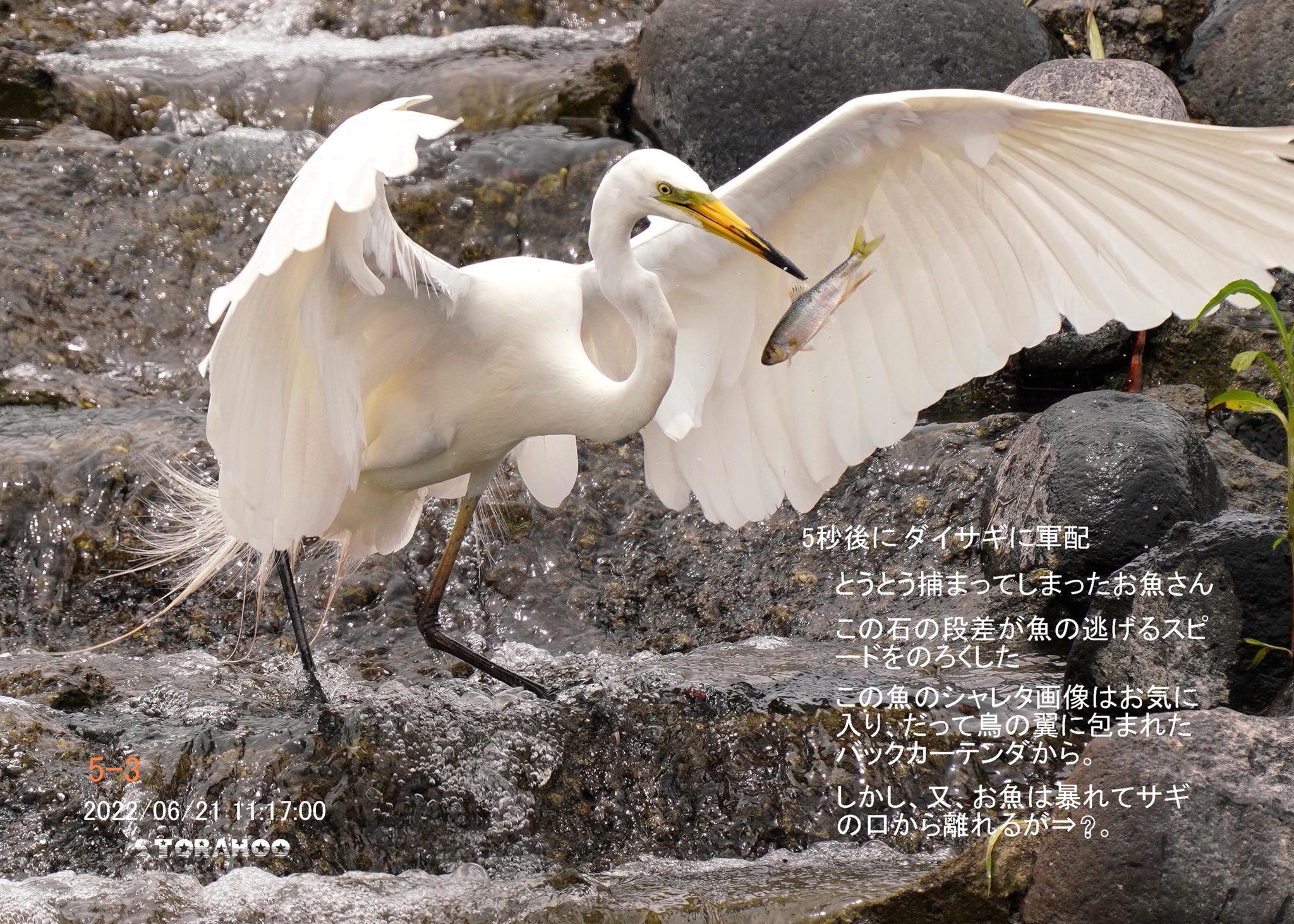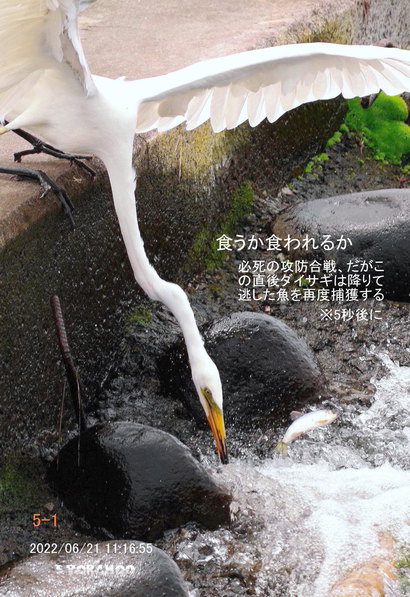 6月21日、自宅直近の碓氷川の安中市板鼻堰で観察撮影しました。ダイサギが魚道の縁から川の上流に上がろうとする魚【オイカワ】を狙って捕獲する貴重なドラマチックな場面です。ダイサギはサギ類の中でも最も大型で特に首が長く脚も強靭、強い水流の中でも餌探しが他のサギ類より優れているようです。連続画像、特に最初〔5-1〕の段差があるような場面は、首長の利便を最大限に生かした画像です。※6月に入り、この板鼻堰は6月20日まで例年恒例の太平洋から利根川を経由し、碓氷川のさらなる上流に溯上する天然アユが多く見られました。サギ類は川魚にとって(特にアユ)最大の天敵です。※オイカワの直接、堰に挑戦する水面飛び出しの画像を番外として6枚目に貼付しました。
