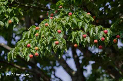 入園して直ぐの大きなヤマボウシ、果実が赤く色づいてお出迎え