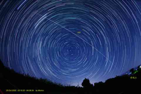 画像:星の日周運動9時間の終わりに、国際宇宙ステーショ通過入れて