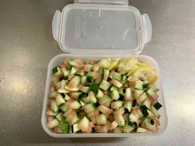 スイカの皮は賽の目に切って、2Lの密閉容器に入れて冷凍し、自然解凍したものをキエーロに入れました。(冷凍により細胞を壊し、早く分解消滅させるため)