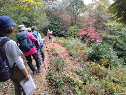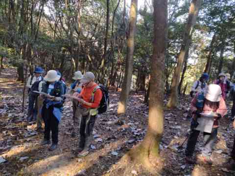 11/17恒例の読図山行、今回の参加者は16名(内一般1名含む)。天気が不安定で心配でしたが、幸い何とか持ってくれて山行に支障はありませんでした。コースは3年前と同じ「音羽山」。地図の見方、地形の見方、コンパスの使い方等の基本事項をくり返し実習しました。初めての方や、慣れていない方が多く、同じ事を何回も繰り返し説明・実習した末に、「分った!出来た!」と満面の笑みがとても印象的でした。最近急に寒くなってきたお陰で彼方此方で紅葉も楽しみながら良い勉強会でした。