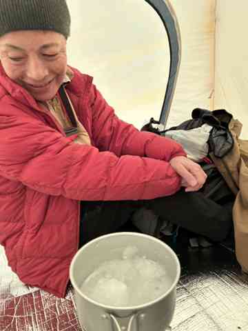 テントの中に入ったら、すぐに雪を溶かして水作り。大袋に入れてきた雪を次々溶かして水に。これも結構時間かかったね。