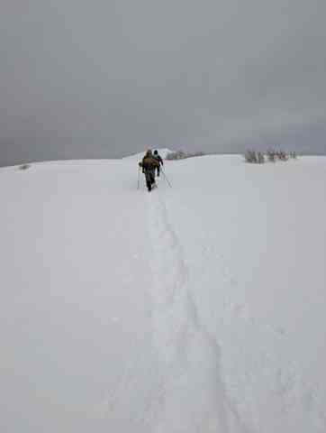 いいねえ!!頂上から寒風峠へ、足跡のない雪山を、尾根沿いの大きな雪庇を眺めながら歩きました。