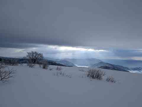 頂上からの景色は、朝の日の光でモノトーンの幻想的な世界。テント泊でこそみられる景色。