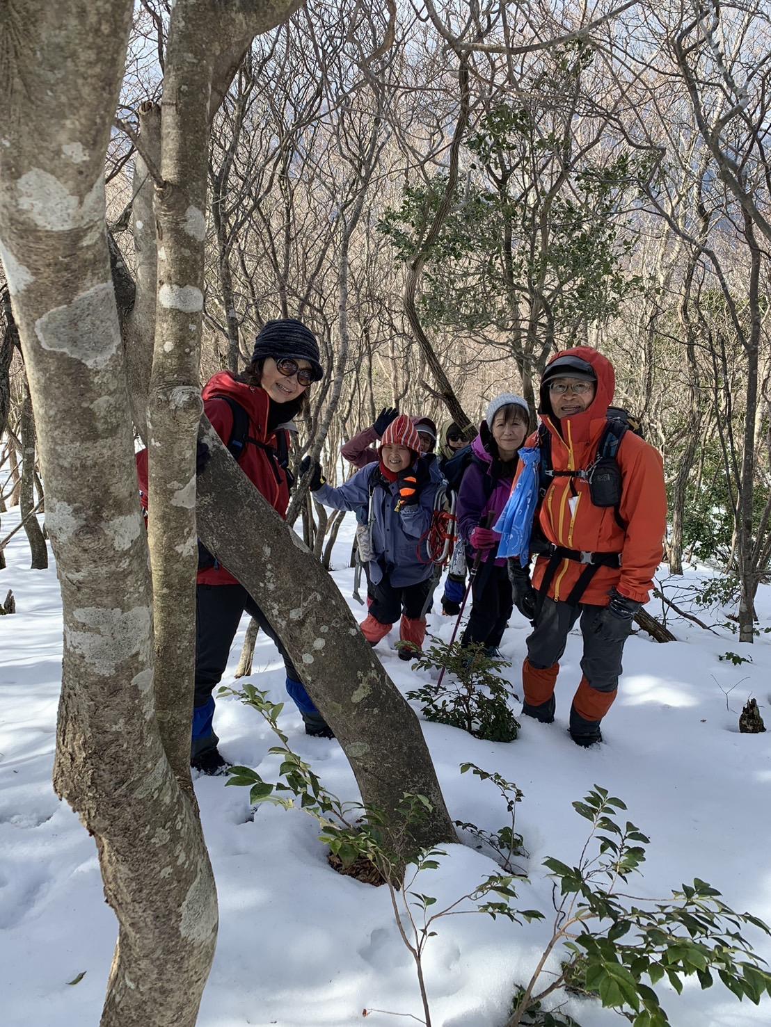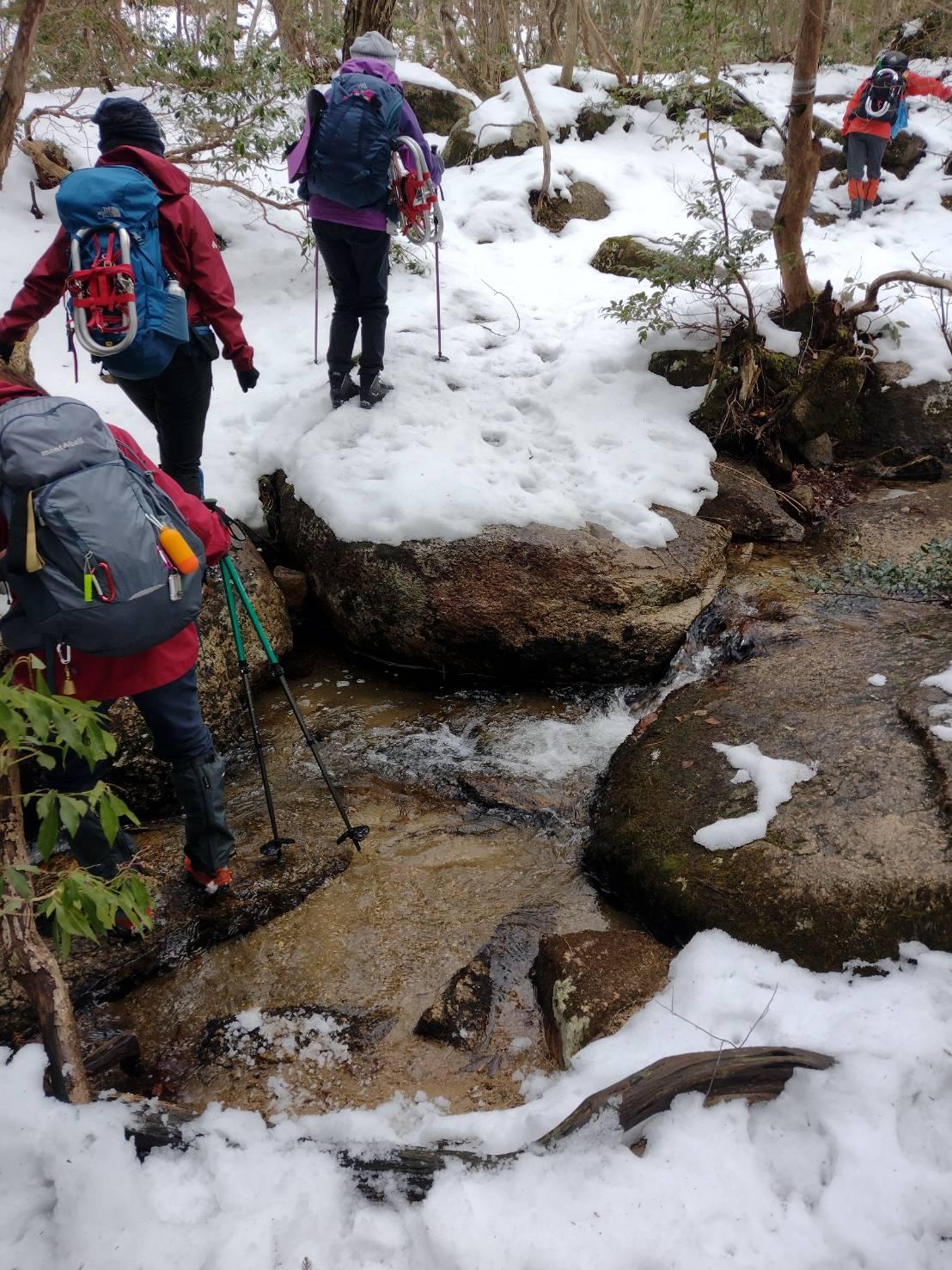 2/17(月)比良滝山例会、参加者7名でした。前週までとても寒かったのに生憎この日は暖かくなり、雪が溶け始めてズブズブの所も彼方此方。涼峠までくるとかなりしっかり雪がありました。ルートが分りにくいので目を凝らして赤テープを探しつつ何度も渡渉を繰り返し寒風峠に到着。正に名前の通り冷たい風の通り道。ここから方向が変わりアップダウンを4~5回繰り返して滝山山頂に到着。食事の後ピストンで下山開始。3人が初めてのワカン体験を楽しみました。比較的近場で雪山を楽しめました。