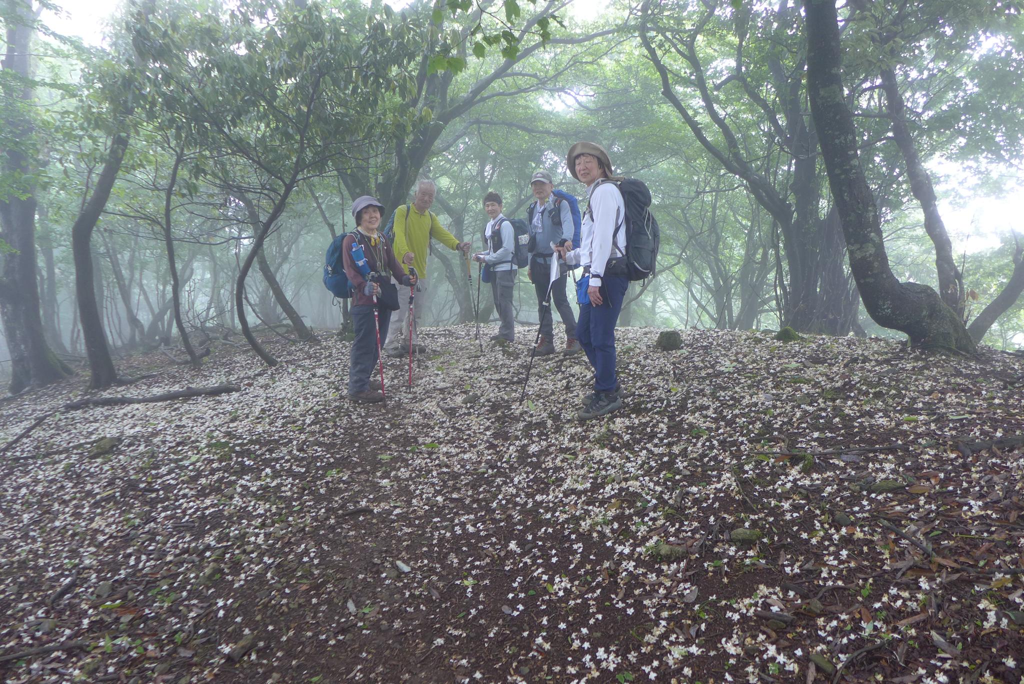 ガスに包まれ巨木と白い落花が幻想的な尾根はここのこの時ならではのものでした。