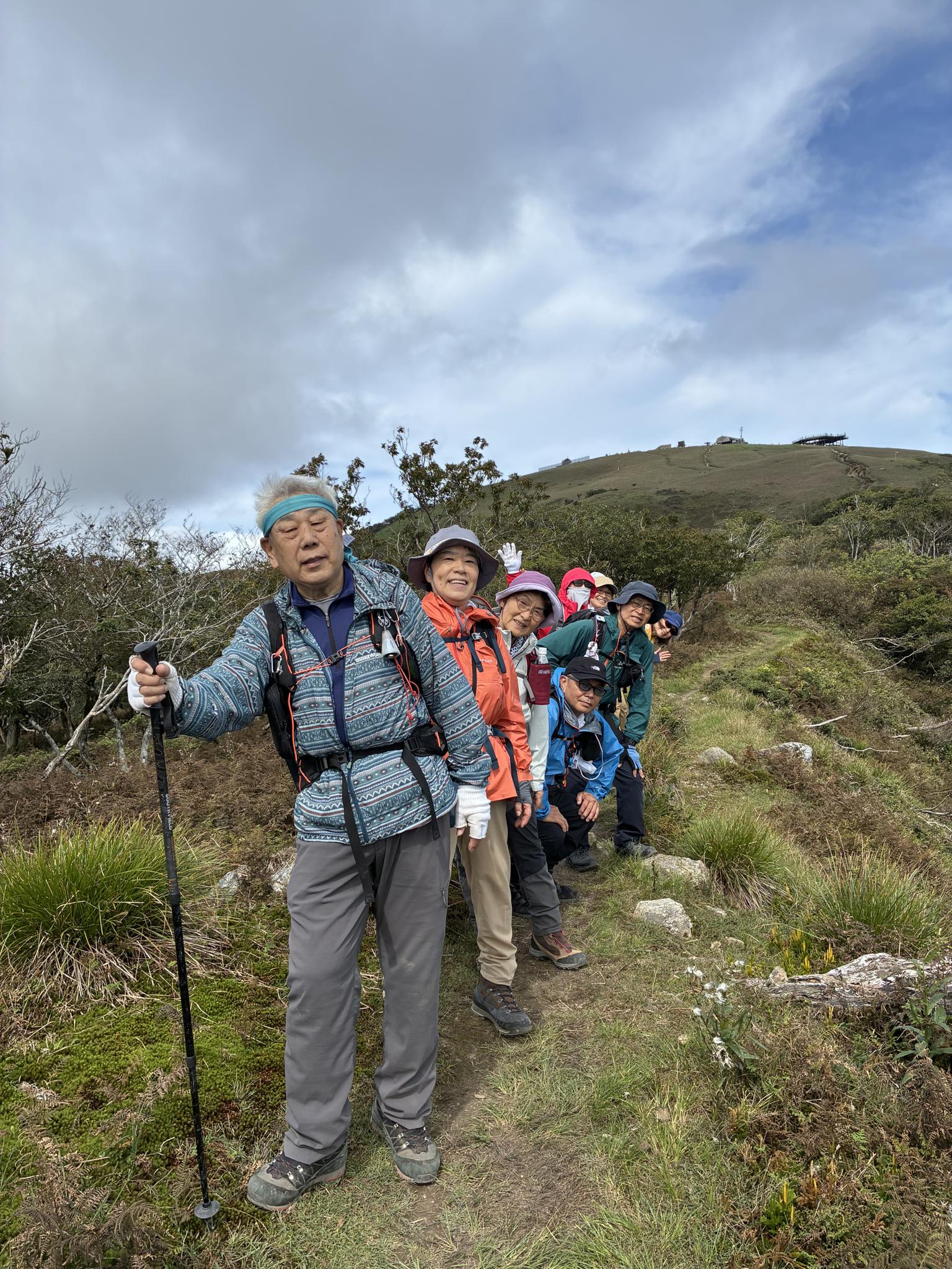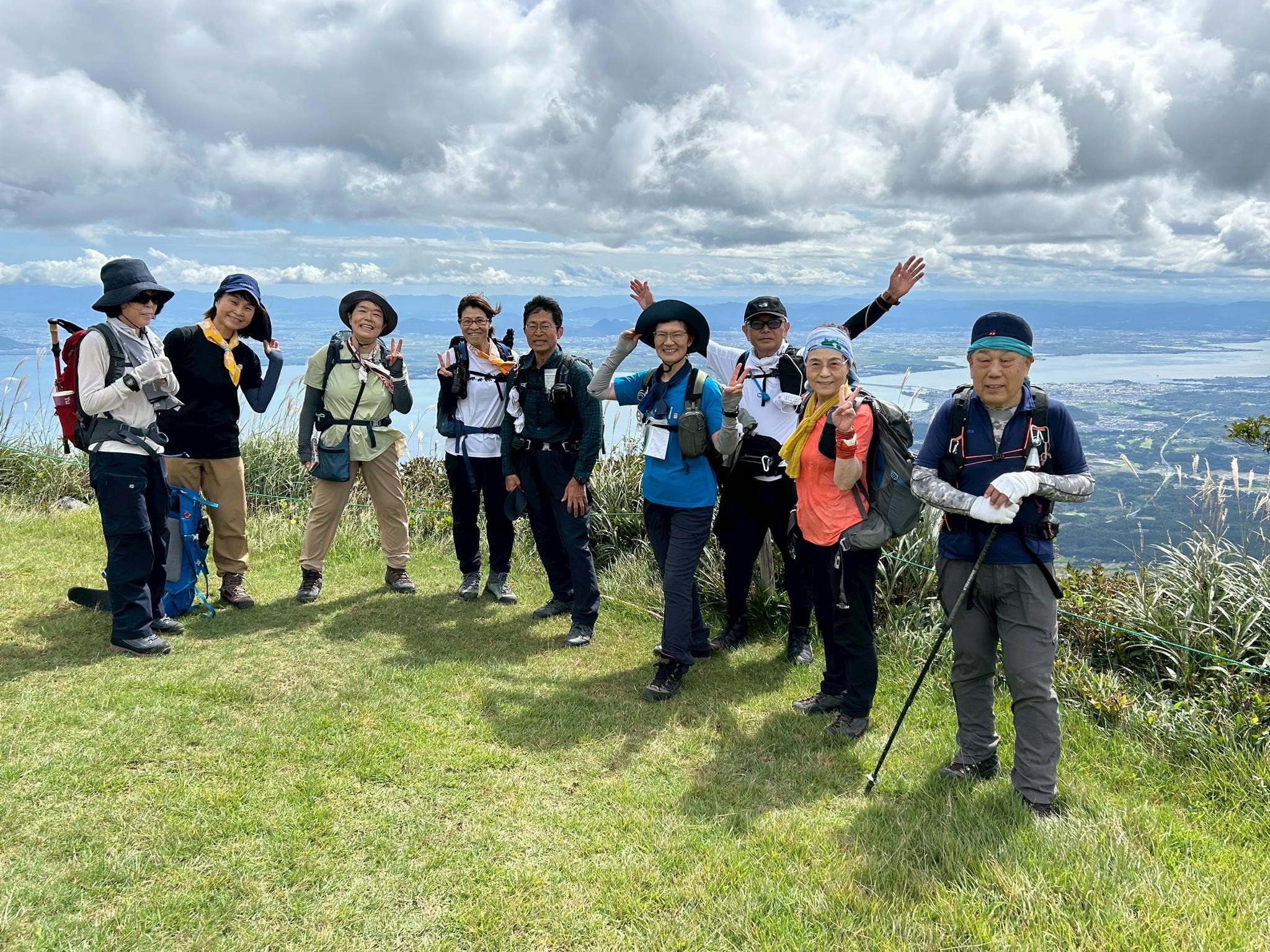 蓬莱山の一等三角点にみんなでタッチ
