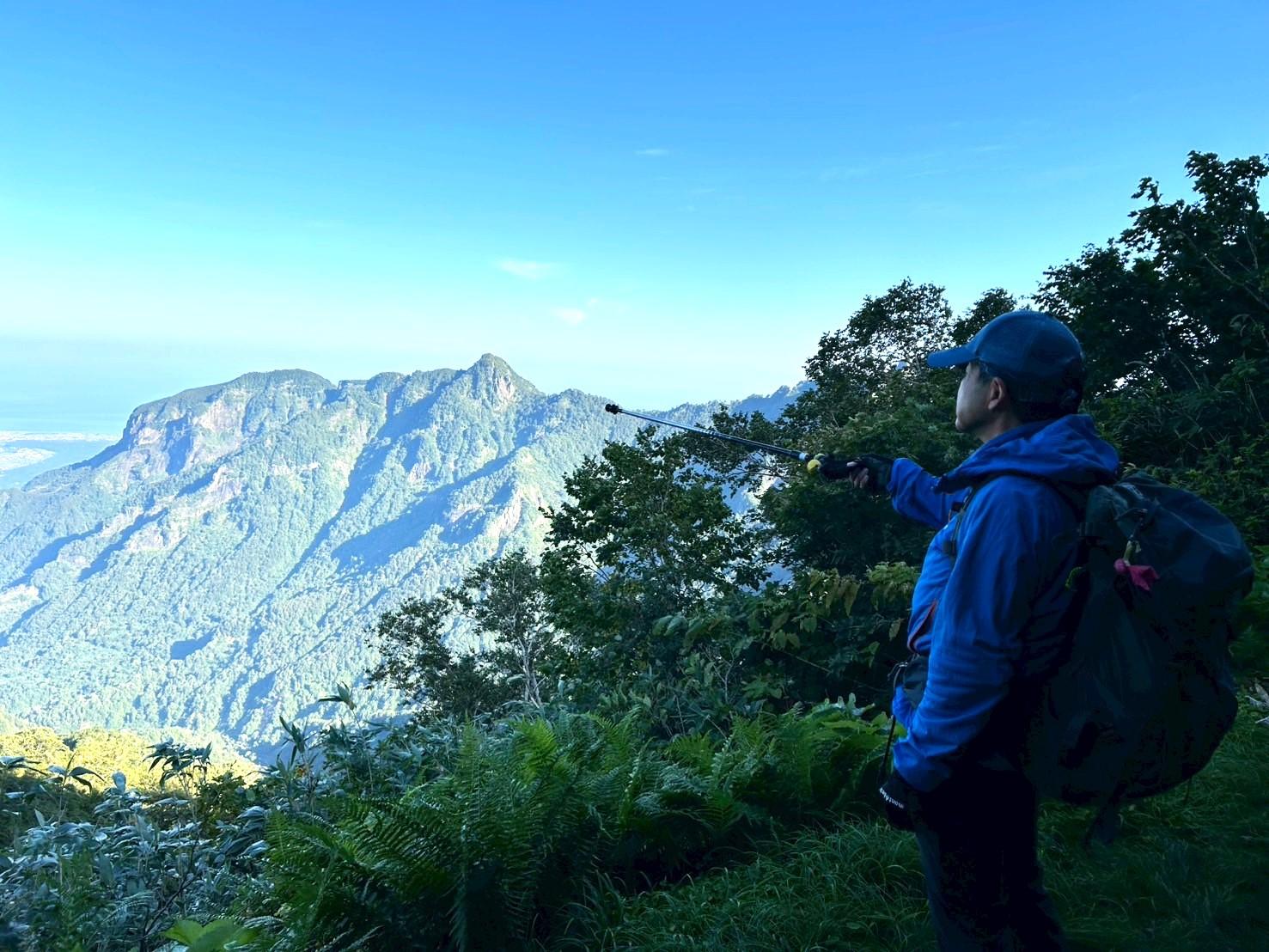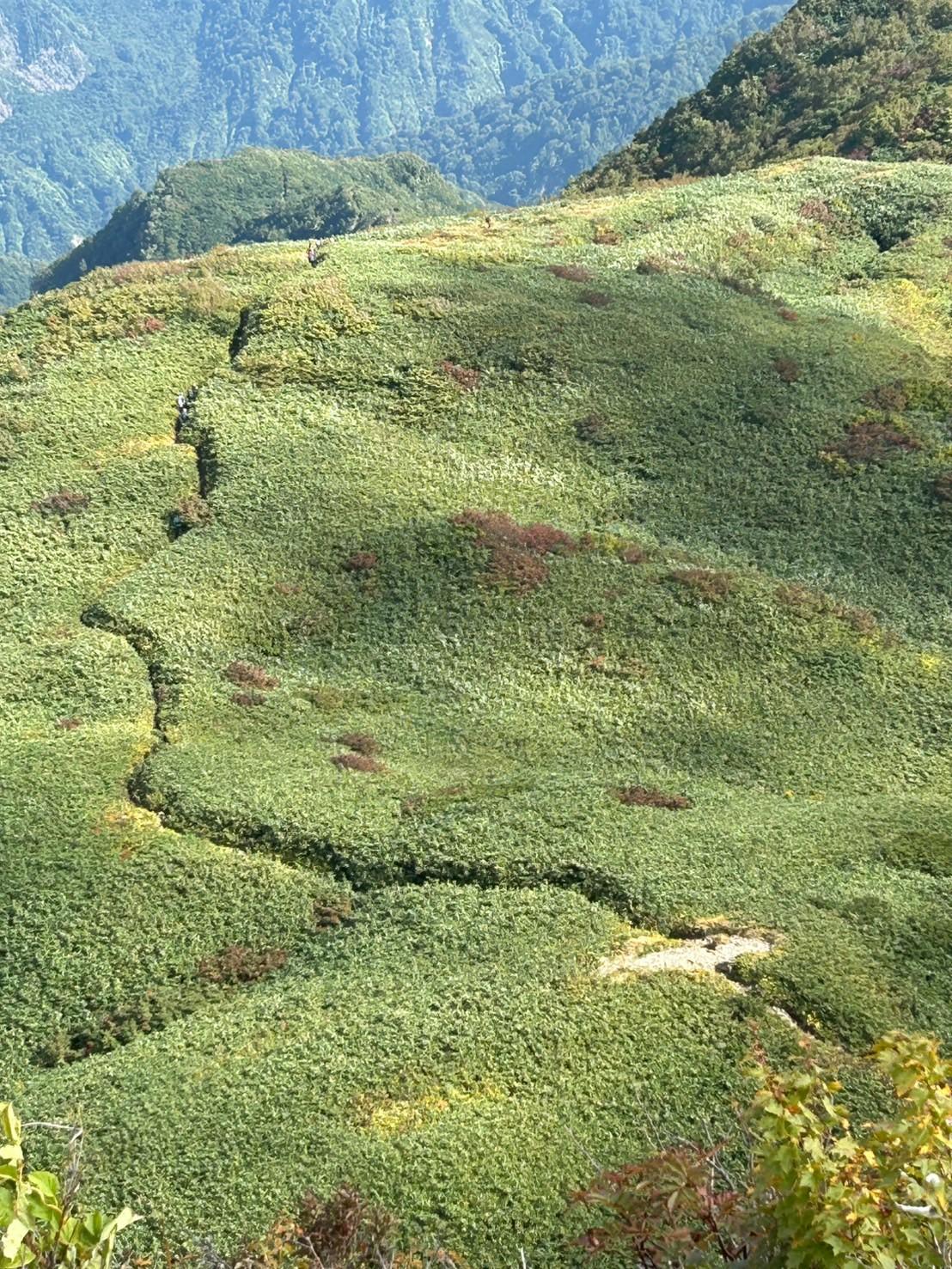 雨飾山頂上から笹原の中に『女神の横顔』がクッキリ!疲れを癒してくれます。