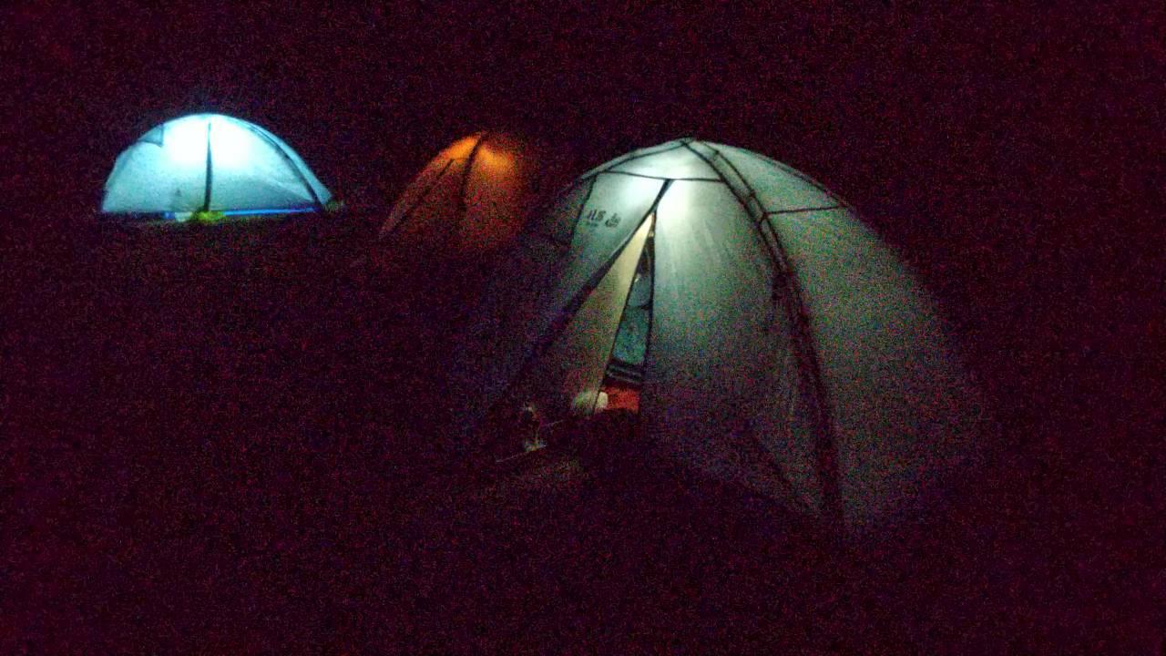 テン場は広々貸し切り。夜中に光るのは遠い星と3つのカラフルライトのみ。