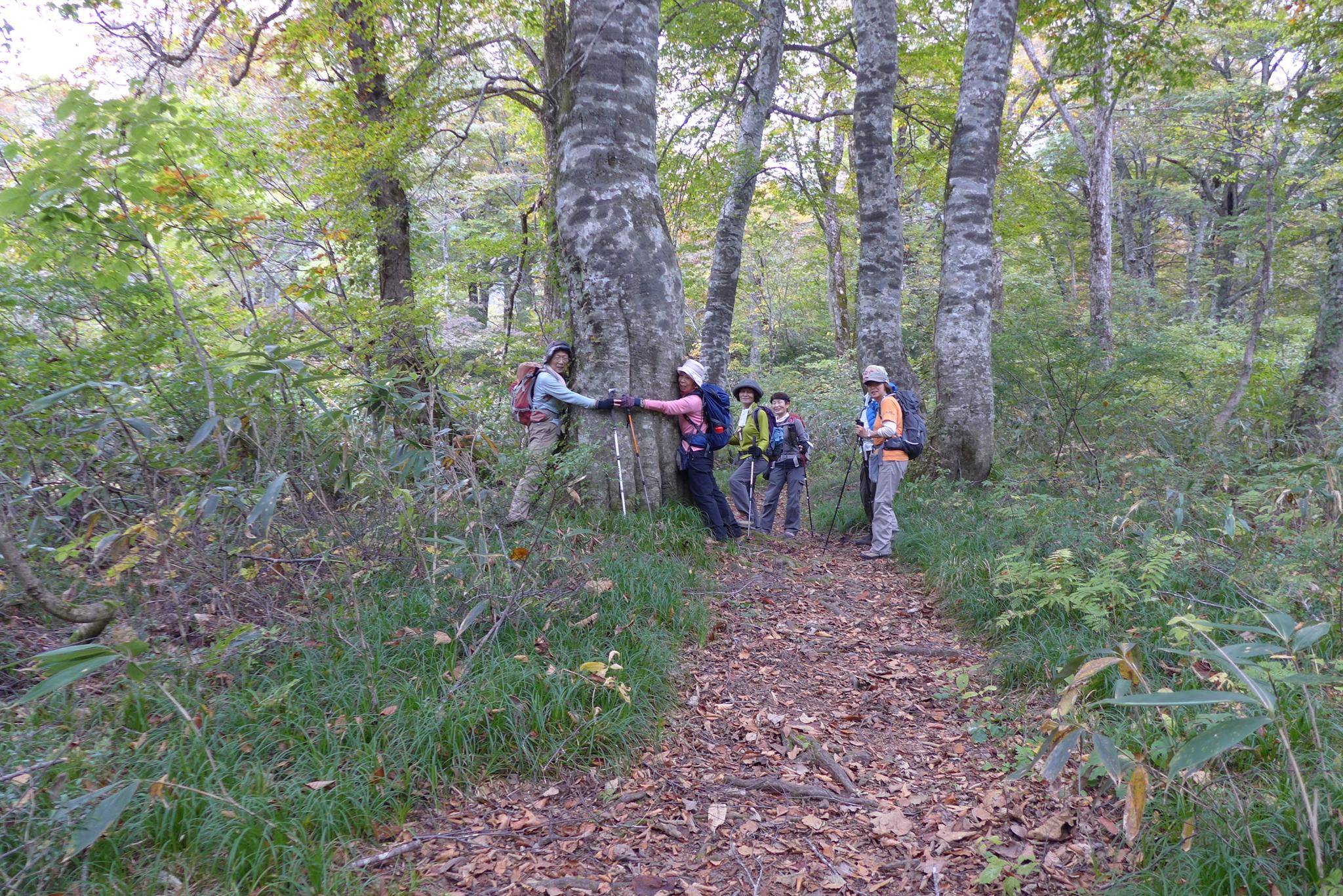 ブナの巨木に抱き着く二人です。