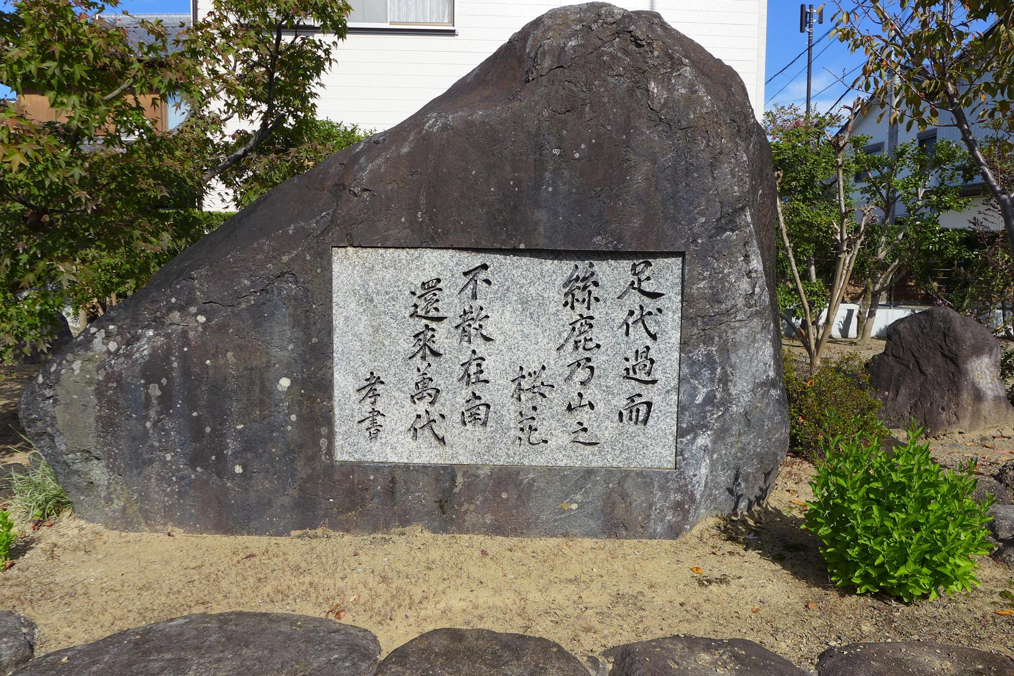 中将姫ゆかりの得生寺で万葉歌碑を読んでいます。「足代過ぎて絲鹿の山の桜花散らずあらなむ還りくるまで」(巻7―1212)詠み人知らず