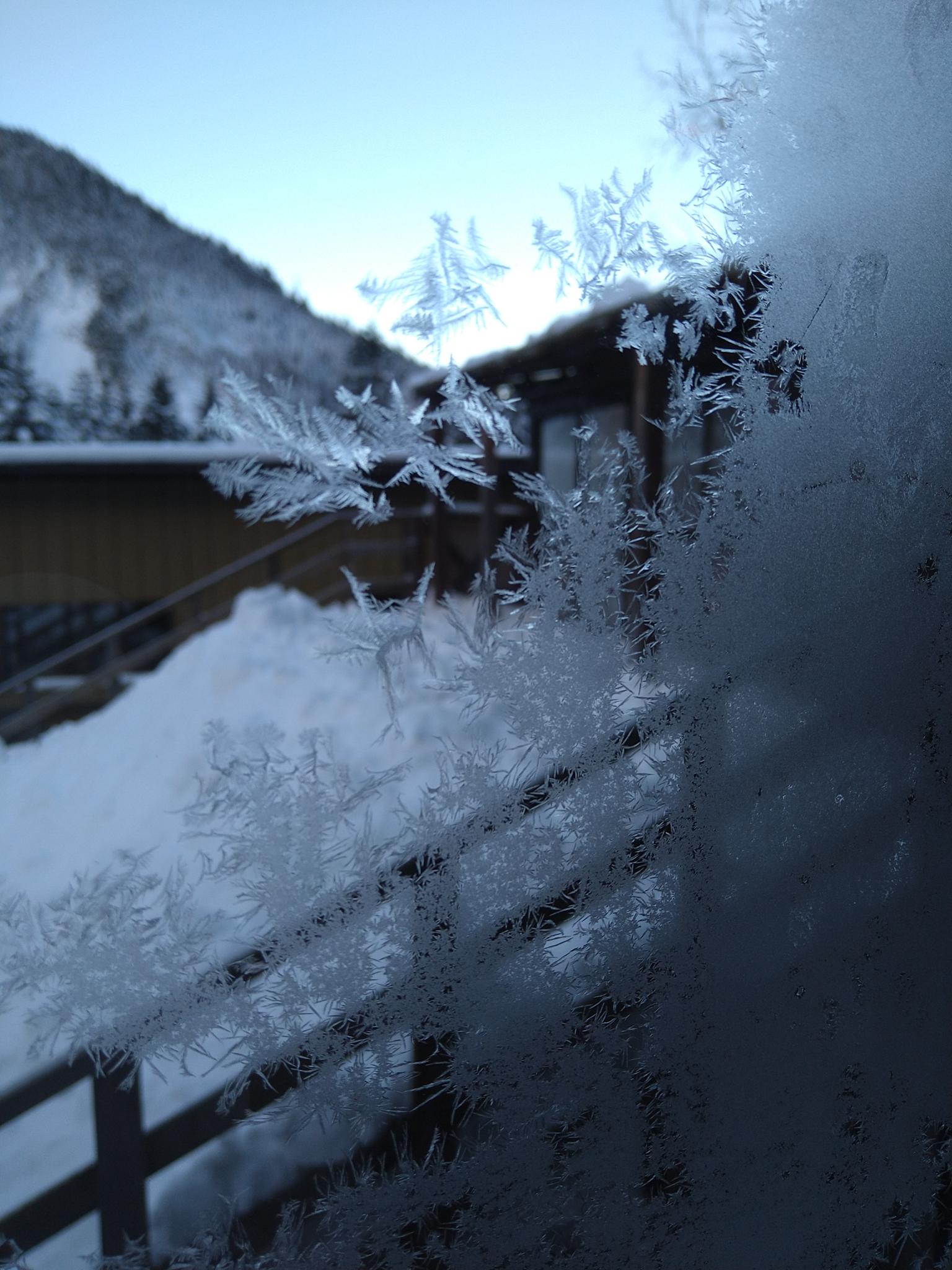 朝、小屋の窓についた結晶。