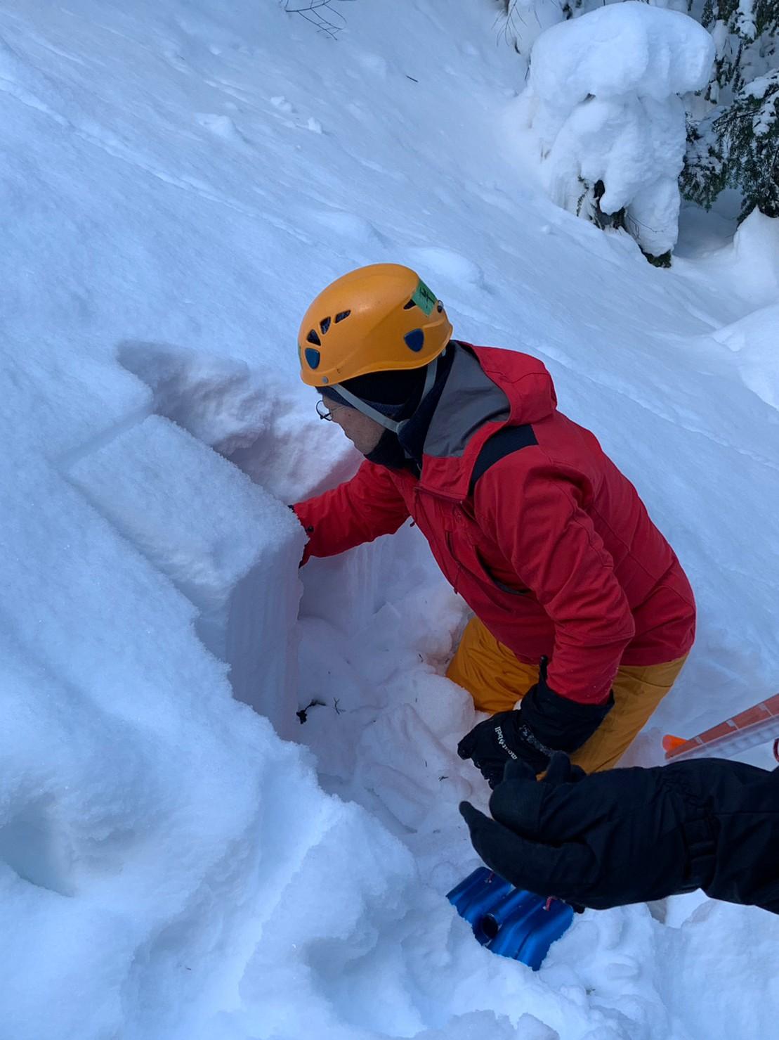 2日目、滑落停止訓練をする前に雪崩の危険性を調べるため弱層テストをしています。シャベルコンプレッションテストをするために雪を切り出しているところ。