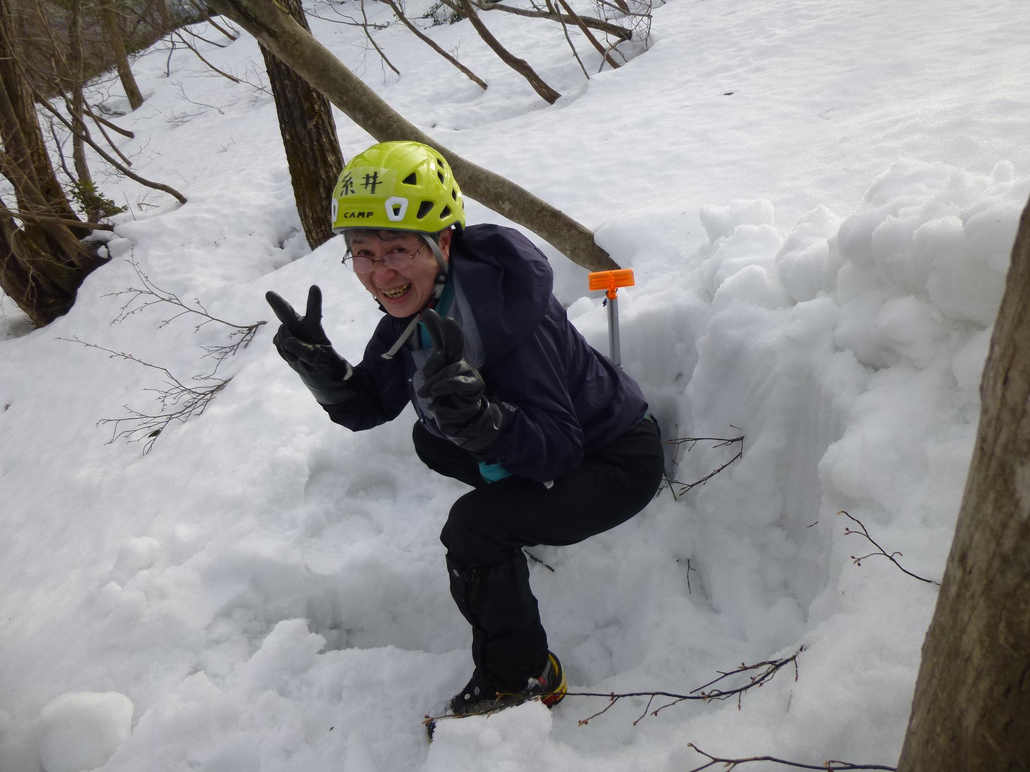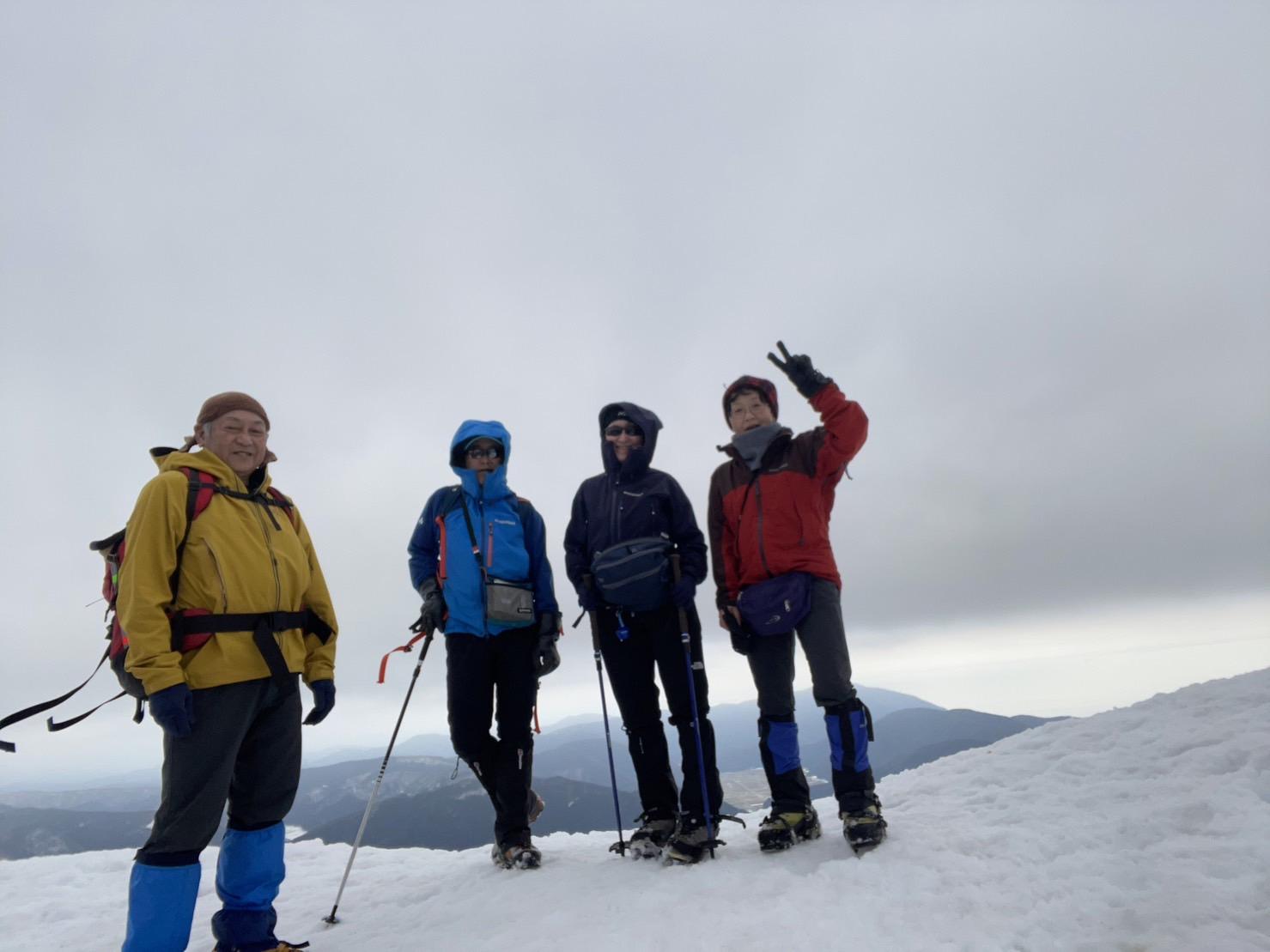 頂上から下山すると、ちょうど6人の赤坂山山行グループがブナの木平でアイゼンをつけているところでした。