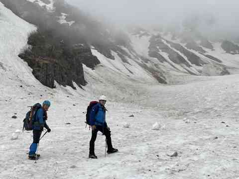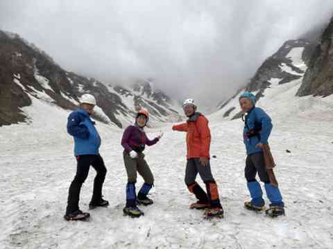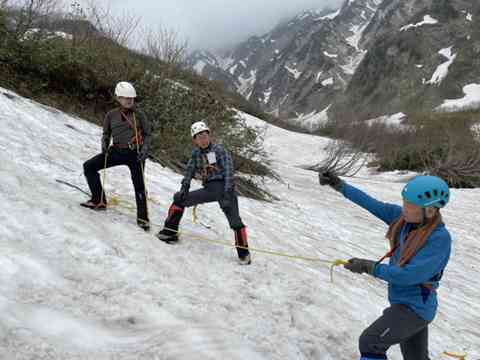 大雪渓から下りてきて白馬尻小屋跡の辺りの傾斜地で雪の急坂滑落防止の救助策をリーダーから伝授!