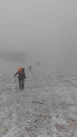 傾斜が緩やかになり視界が開けた時、いきなり雪の塊が前方から転がってきました。ラグビーボール状のものやバスケットボール状の大小次々20〜30個ぐらい?ゴロンゴロン転がってきてびっくり!「ブロック雪崩だ」とリーダー。まるでボール避けゲームをしてるかのように右へ左へ動いて避けた。「足元を見ず前方を見て歩いて!」とリーダーが叫ぶ。緩やかな傾斜のところでよかった!落石した石や大きな岩があちこちに。