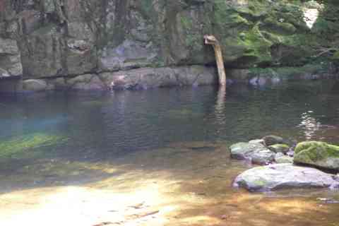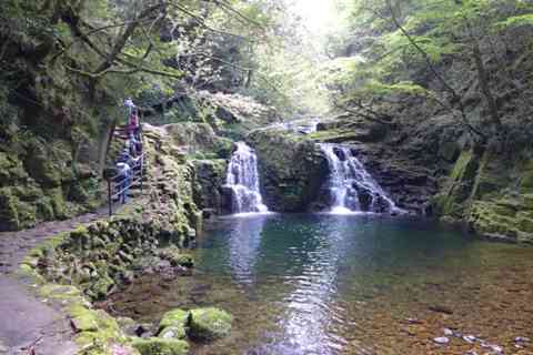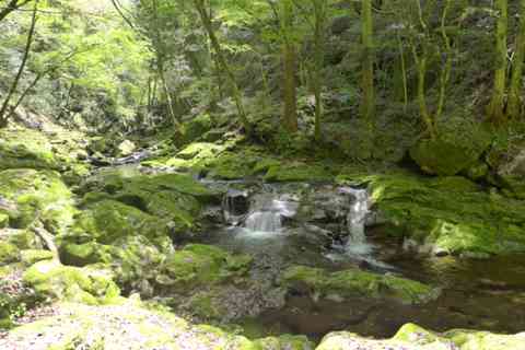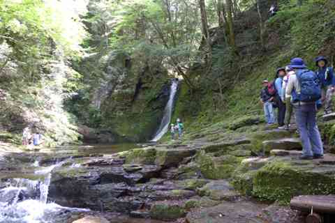 次々に水の尾を引く滝、滝、滝、新緑の若葉を映す沢の流れ、苔むした岩、両岸の岩壁に響くみそさざいの鳴き声、などなど。