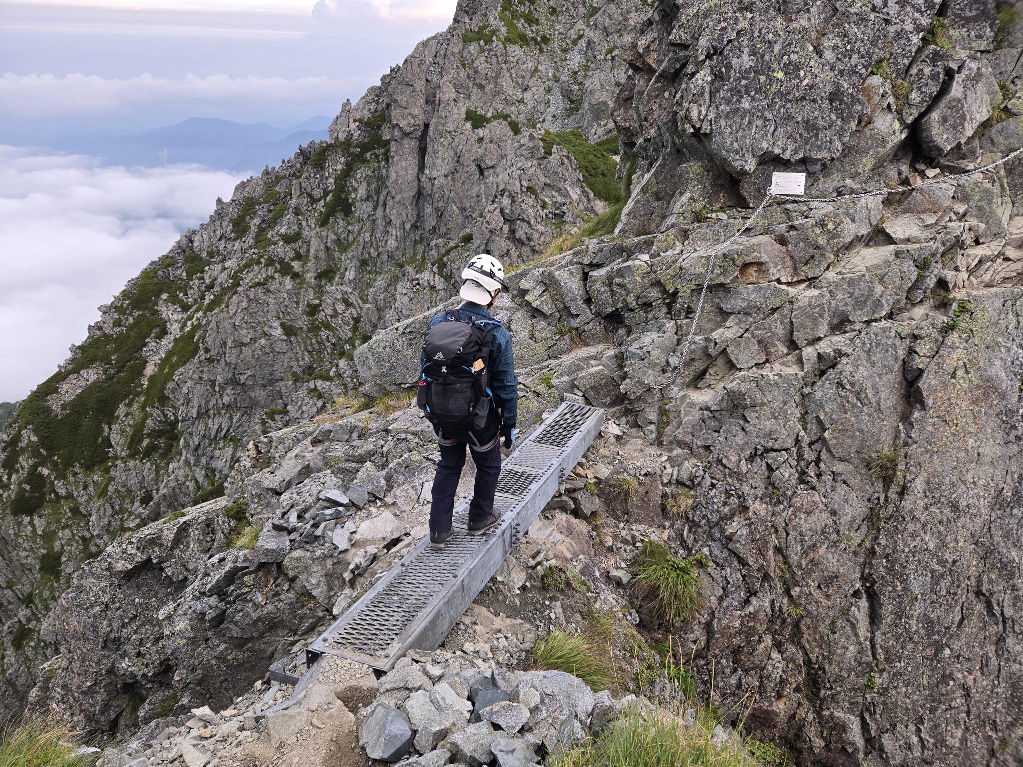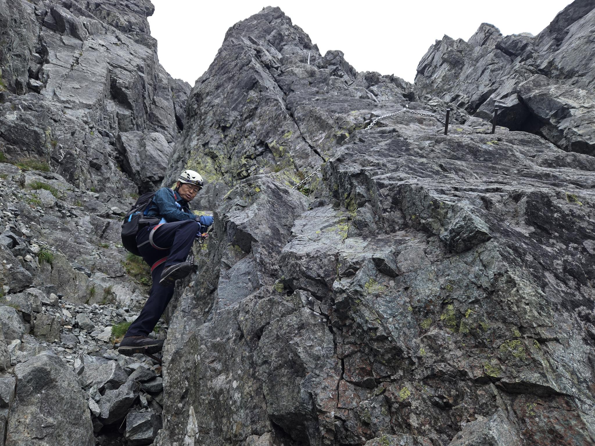 頂上直下の難関・「カニのタテバイ」にさしかかると雨が降り出した。