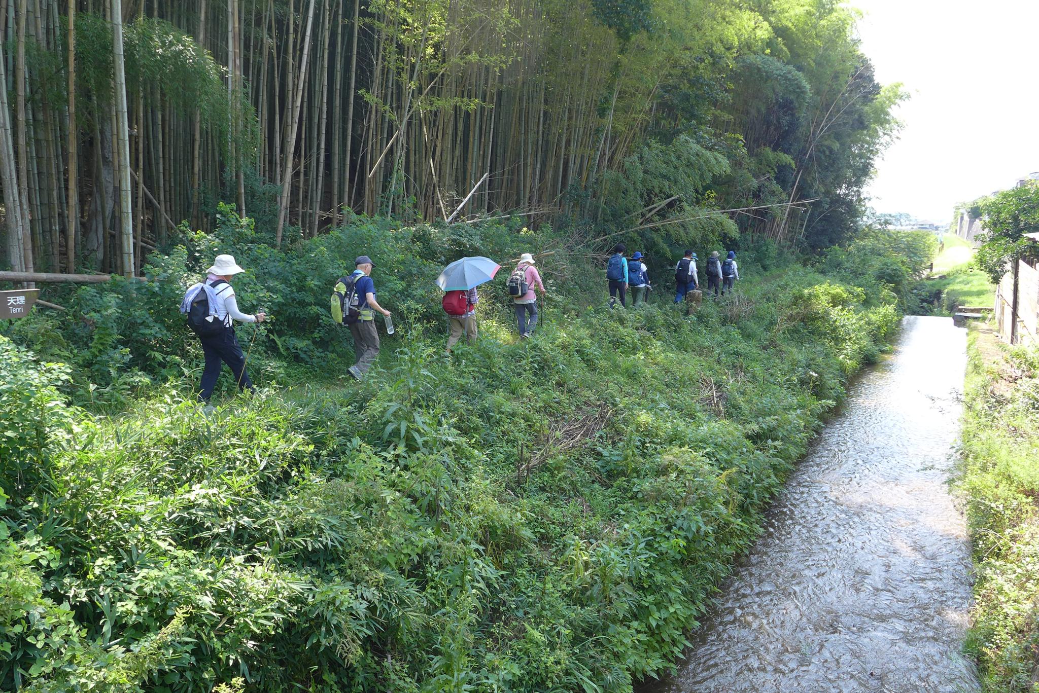 竹やぶの草生した道。水の流れがあると多少とも涼しい。