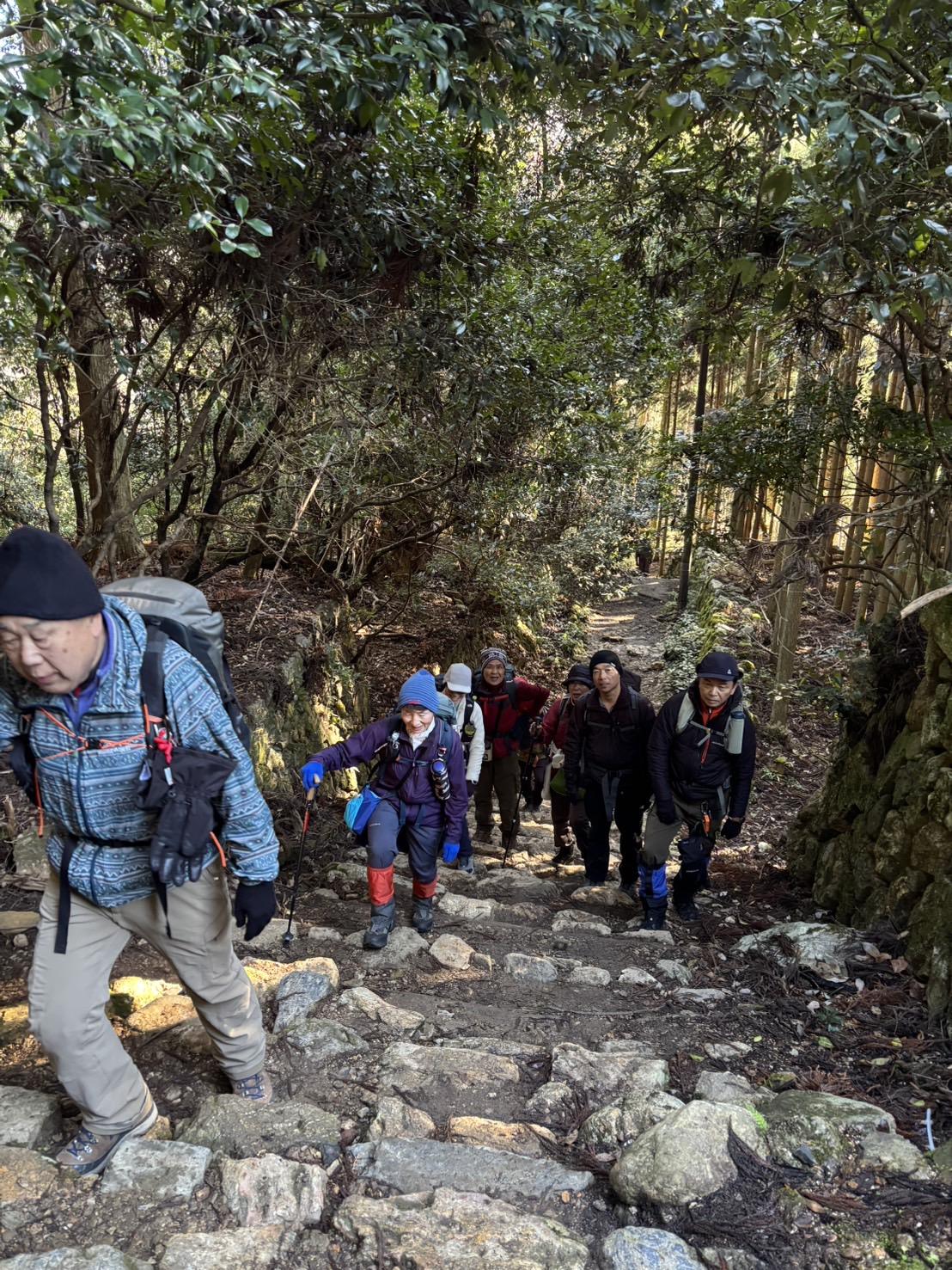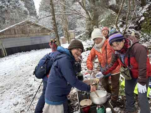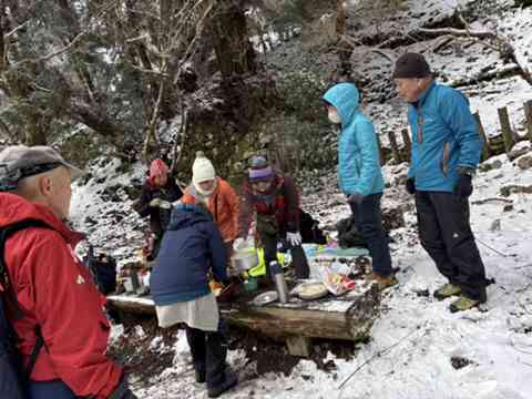 みんなでお水や餡子、お餅を運んで登りました。