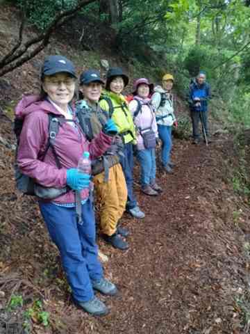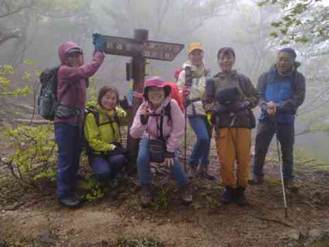 「縦走歩荷トレ・7メッツ登山をめざして」というテーマの例会。当初例会を企画したYさんの都合が悪くなり、ピンチヒッターとしてNがCLを交代して実施しました。参加者7名。天気予報は曇りと小雨の間で日々変化し数日前からヤキモキしながら当日を迎え、多少の雨は覚悟してイン谷口登山口を出発。途中急登や岩場などワンゲル道の特徴とも言えるルートを皆さん一生懸命頑張り釈迦岳山頂に到着。辺りはすっぽり雲の中、風もあり寒さ対策をして昼食のカップ麺で温まりました。当初のルートはカラ岳・北比良峠に回る予定でしたが、天候不良等を考慮してコースを短縮してそのままイン谷口へ下山。幸い最後まで雨に遭うこと無く山行を終えることができました。