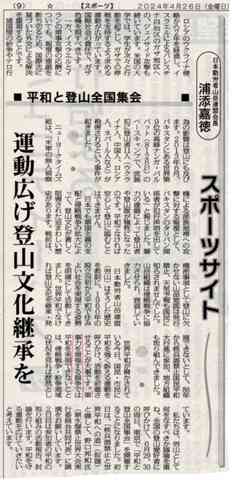 本日240426しんぶん赤旗のスポーツサイトのコーナーに労山全国連盟会長・浦添嘉徳さんの文書「平和と登山全国集会」が掲載されました。労山が平和と登山を分離して考えない基本理念と沿革を簡潔に述べられた上で、世界と日本の現状をしっかり認識し労山として何をなすべきかをみんなで議論し運動を広げようと提起されています。