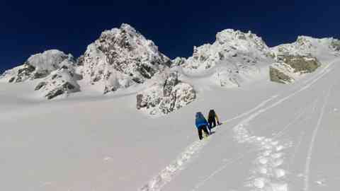 富士山から昇る朝日に感動し、晴天の中乗越浄土へ登っています。Tさんは新雪の中を進んでいます。