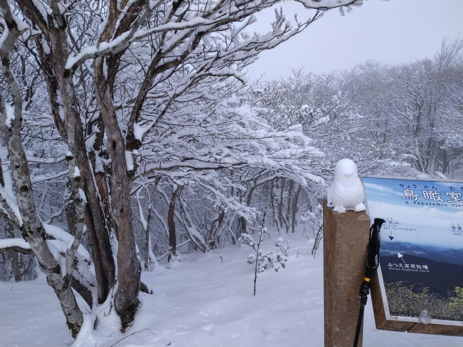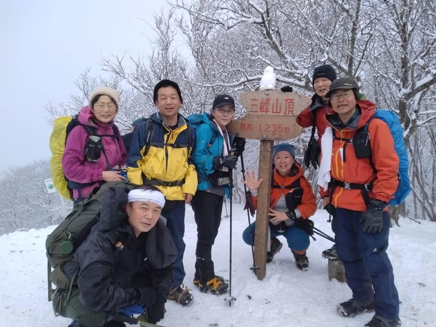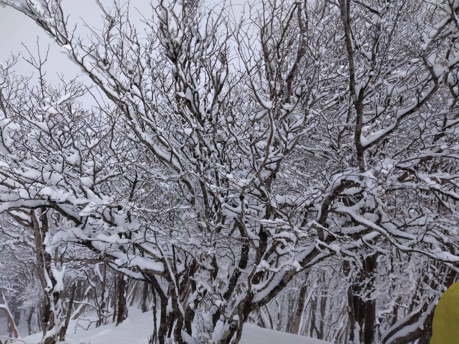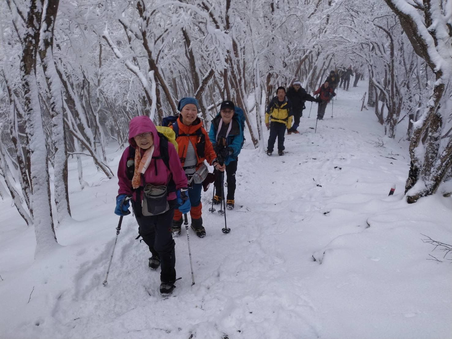 2/4例会として奈良県の三峰山に行きました。参加者7名。榛原駅には何時もの様に大勢の登山客、霧氷バスでみつえ旅行村へ。前日降った雪が到る所に積もっていた。今回は全体的に若い登山客が目立った。中でも40名の高校生+引率の先生方の集団が元気よく登って行く姿は印象的だった。山頂手前の三畝峠からは周囲全体が霧氷、皆の歓声が響いた。山頂では360たっぷりの霧氷に囲まれて夢心地。八丁平では風も無く長閑な雪原を楽しみ下山開始。帰りには姫石の湯で疲れを癒やし、満足感に浸って京都への帰路に着いて。