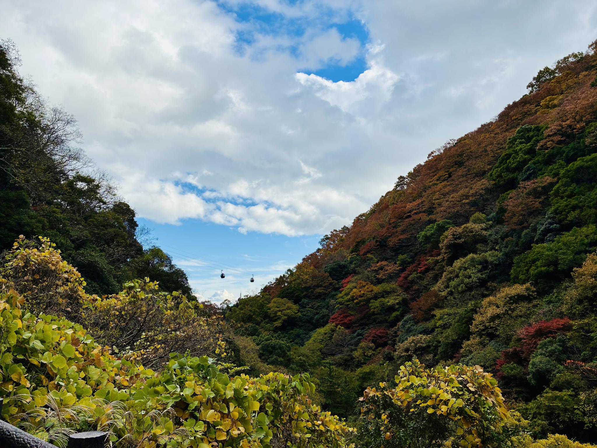 紅葉した山の合間を布引ハーブ園のロープウェイのキャビンが空中散歩