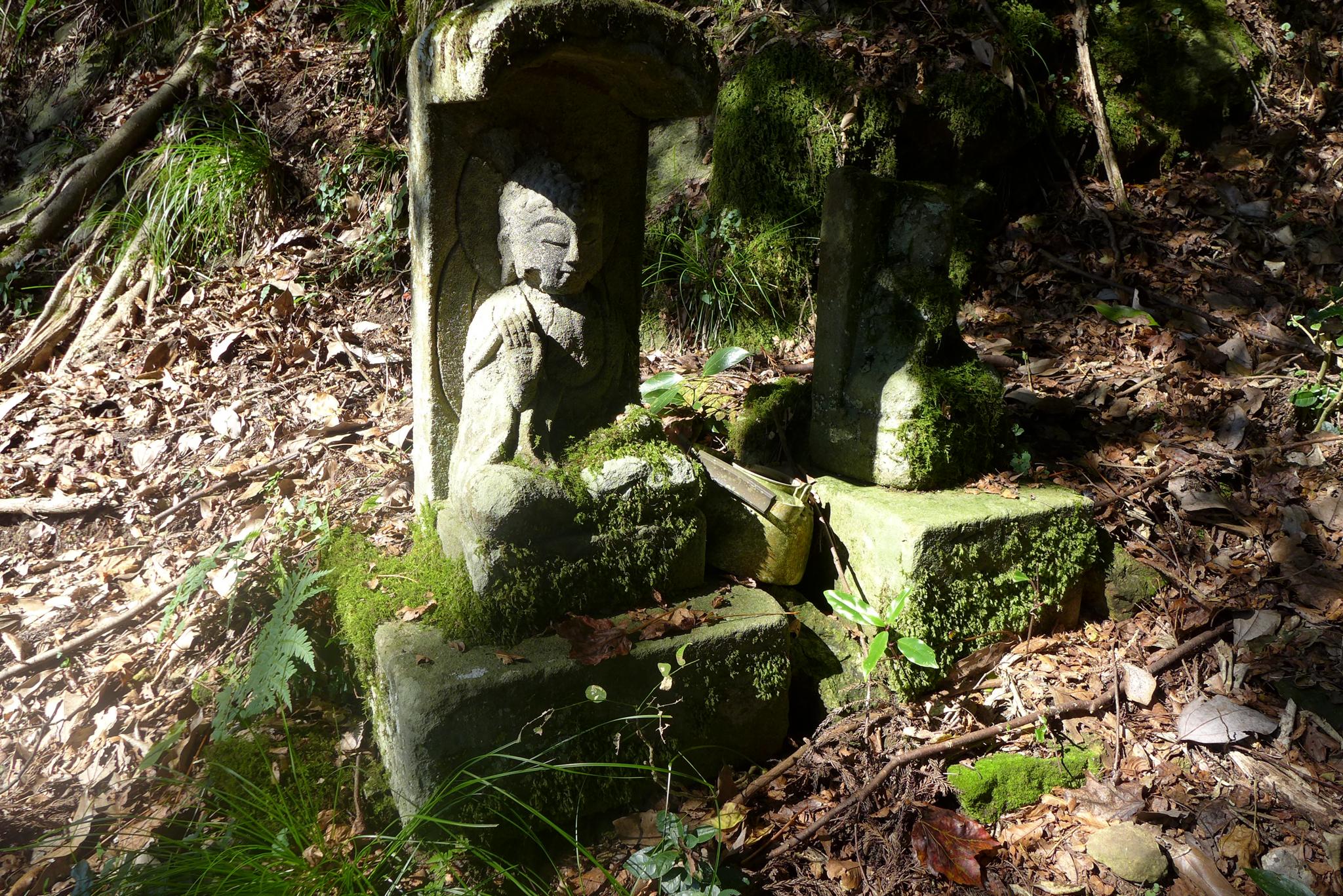 登山口には苔を纏った阿弥陀如来と弘法大師の石像が鎮座していました。