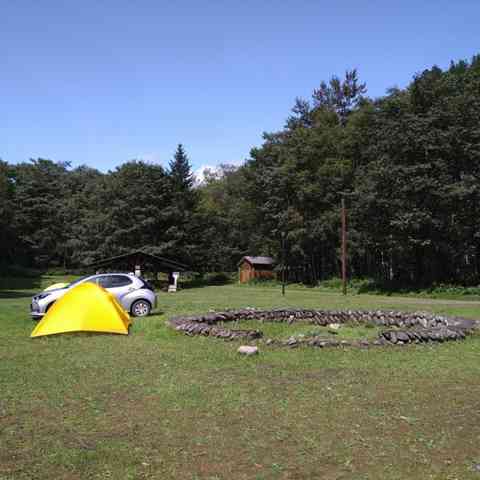 トムラウシ自然休養村野営場でテント泊。250円/人は、北ア涸沢の1/10。エゾ鹿の親子が出迎えてくれます。