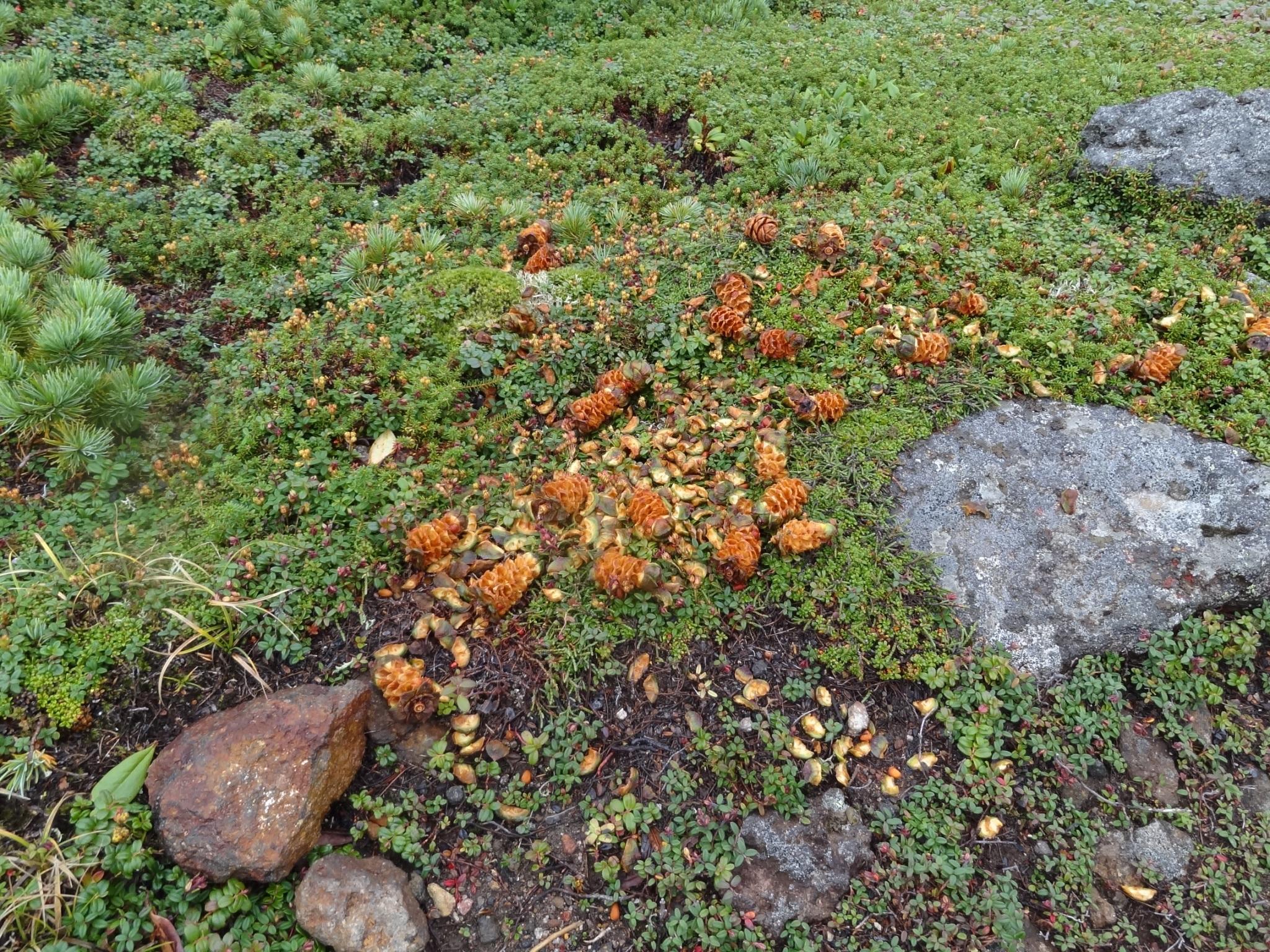 このハイマツの実は誰が食べたのかな?そばにいたのは、ホシガラスとエゾシマリス。