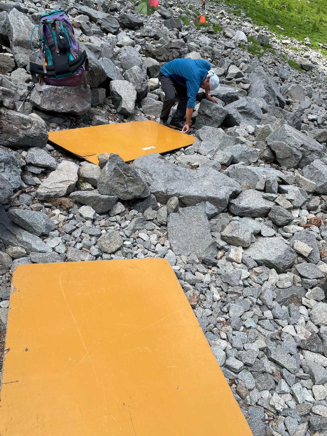岩場でのテント張り、べニアボードがありがたい!