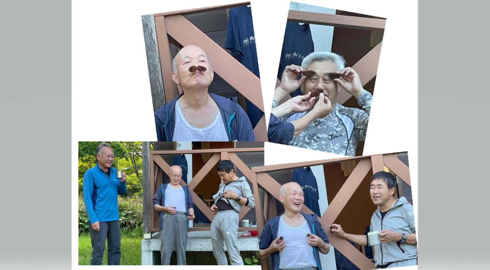 空港からバスに乗り、スーパーで食料を買って歩くこと1時間、北麓野営場に到着。シャワーを浴びて、ビールでのどを潤して一息つくと、おっちゃん(じいちゃん)たちは、童心に帰って松ぼっくりで遊びだしだしました。見てください、このいい顔!!