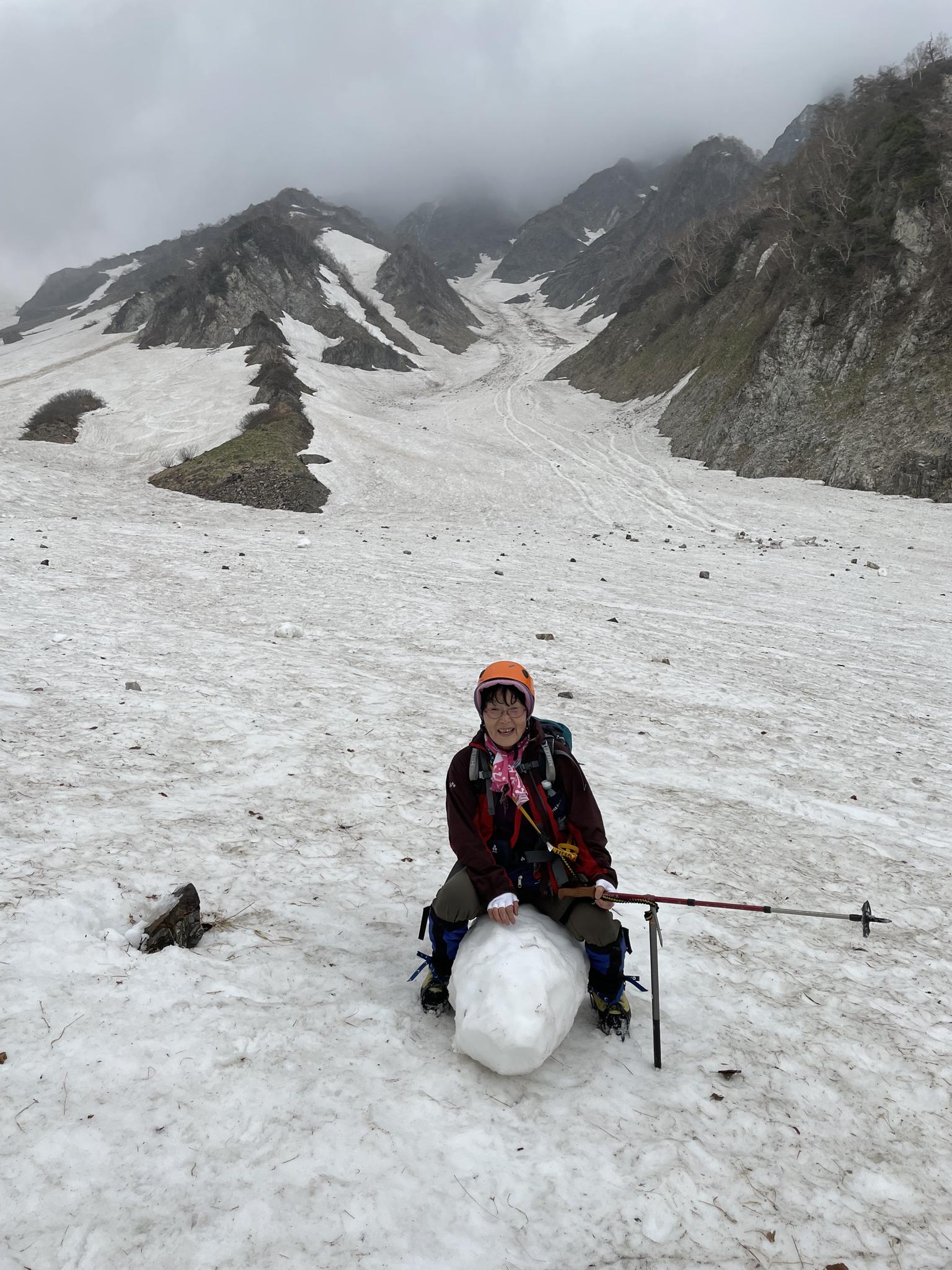 傾斜が緩やかになり視界が開けた時、いきなり雪の塊が前方から転がってきました。ラグビーボール状のものやバスケットボール状の大小次々20〜30個ぐらい?ゴロンゴロン転がってきてびっくり!「ブロック雪崩だ」とリーダー。まるでボール避けゲームをしてるかのように右へ左へ動いて避けた。「足元を見ず前方を見て歩いて!」とリーダーが叫ぶ。緩やかな傾斜のところでよかった!落石した石や大きな岩があちこちに。
