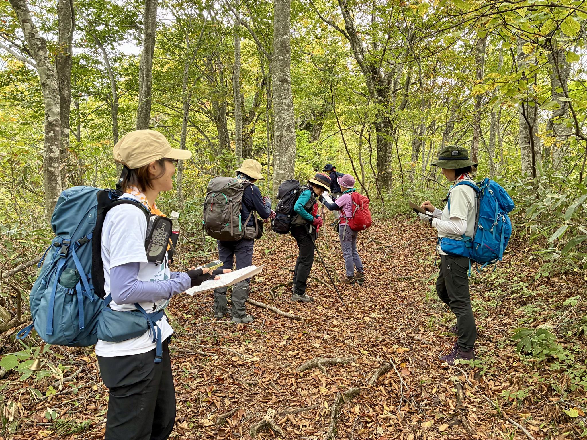 みんなで読図をしながらブナ林を歩く