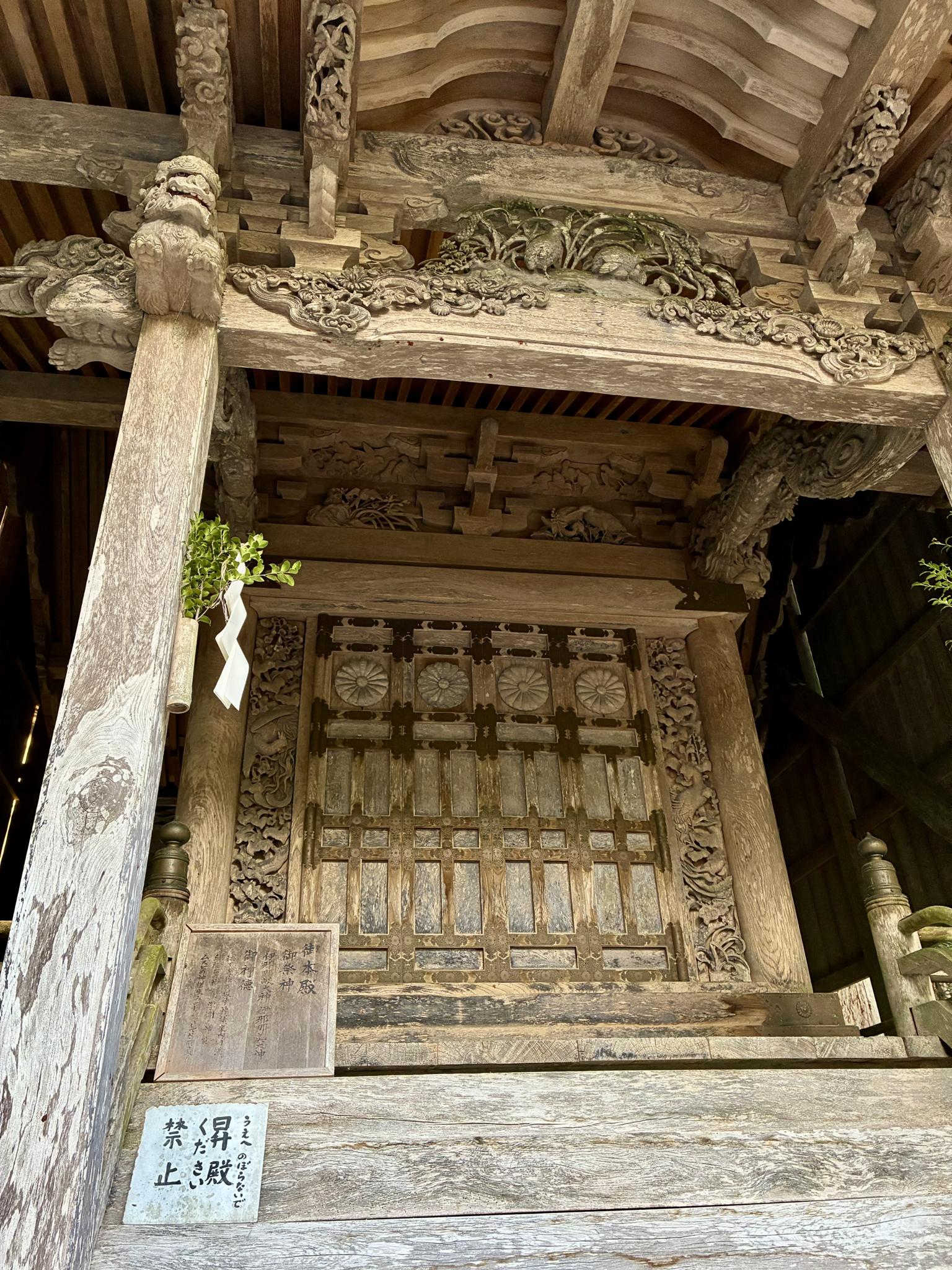 本殿正面「粟に鶉」の彫刻は、県の重要文化財。