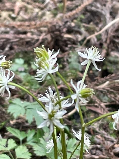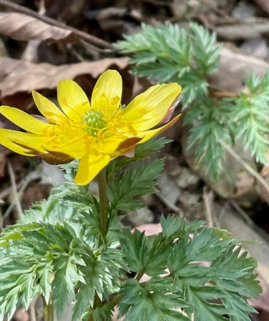 前回のアイゼン行脚が嘘のよう。日差しの暑いポンポン山山頂でパチリ。福寿草とせり葉オウレンの写真はどなたか宜しくお願いします。
